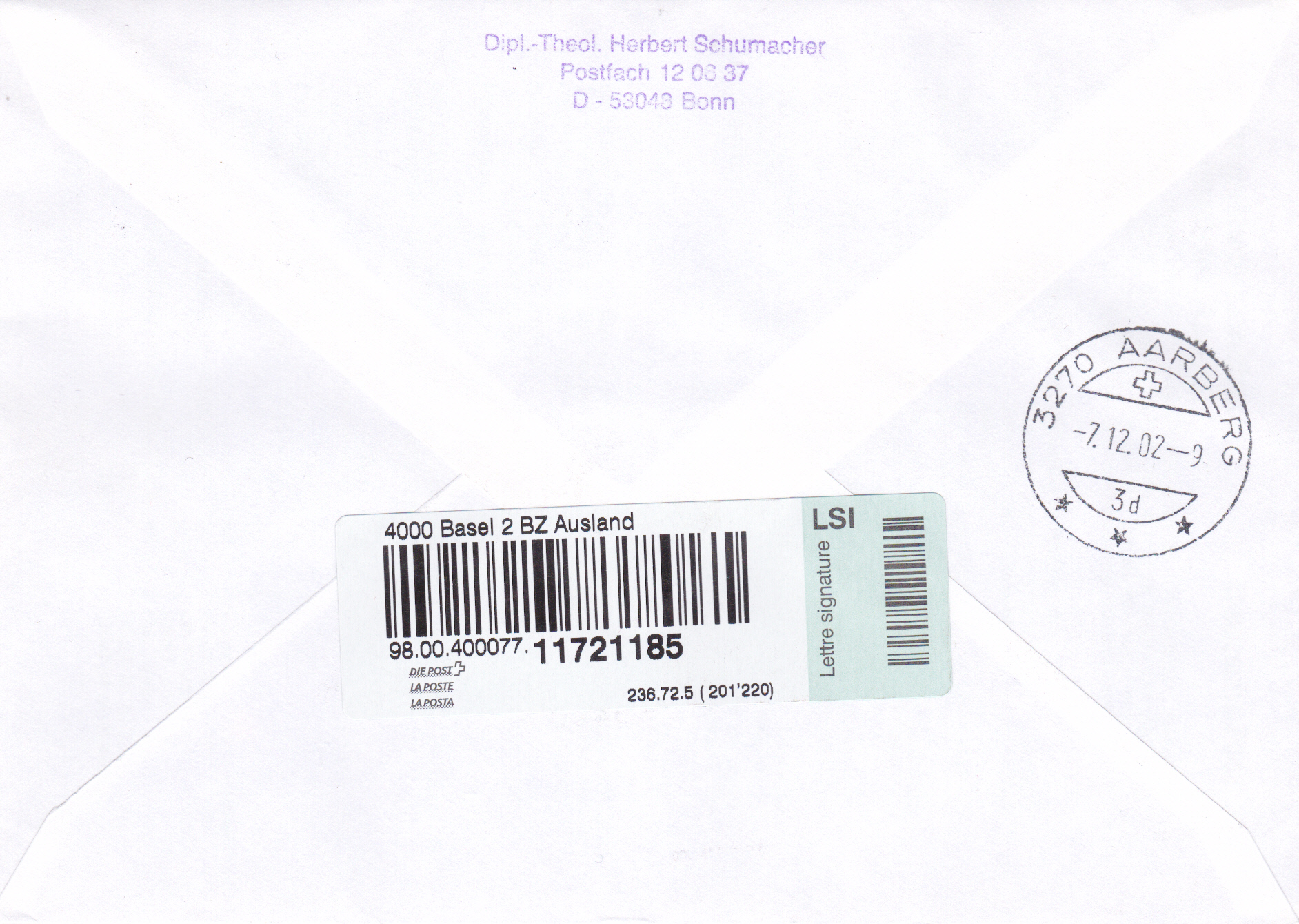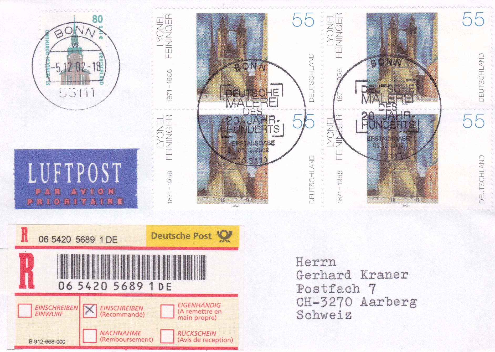 Auf diesem Brief per Einschreiben in die Schweiz wurde ein Viererblock der Marke MiNr 2294 (zu je 55 Cent, zusammen also 220 Cent) mit dem Gemälde "Markthalle von Halle" von Lyonel Feininger mit dem Ersttagsonderstempel Bonn entwertet. Die Zusatzfrankatur mit einer Marke aus der DS "Sehenswürdigkeiten" zu 80Pf/0,41€ (MiNr 2177) erhielt einen Tagesstempel Bonn. Das Porto betrug für einen Brief bis 20g 56 Cent und für die Zusatzleistung Einschreiben 205 Cent, zusammen als 261 Cent.