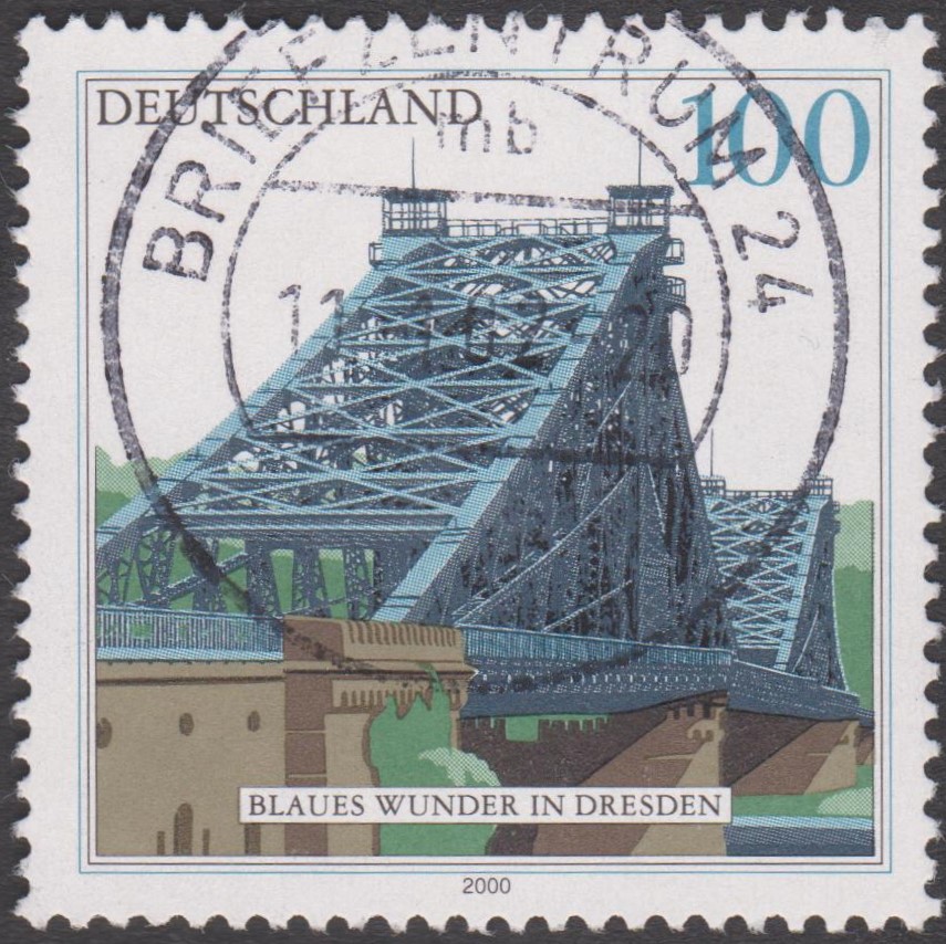 Bund MiNr. 2109 zeigt die Elbbrücke "Blaues Wunder" in Dresden, hier auf ETB 19/2000 mit perfekt zum Markenmotiv passendem Ersttagsstempel: