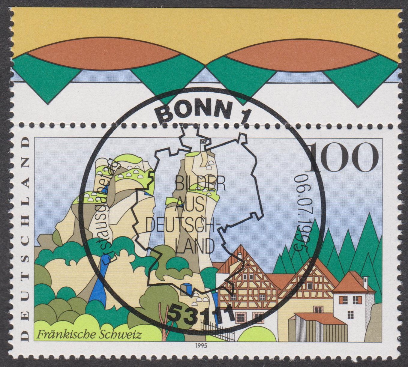 Bund MiNr. 1807 aus der Serie "Bilder aus Deutschland" zeigt die Fränkische Schweiz (Tüchersfeld), hier ein Oberrandstück mit Ersttagssonderstempel 53111 BONN 1 vom 06.07.1995: