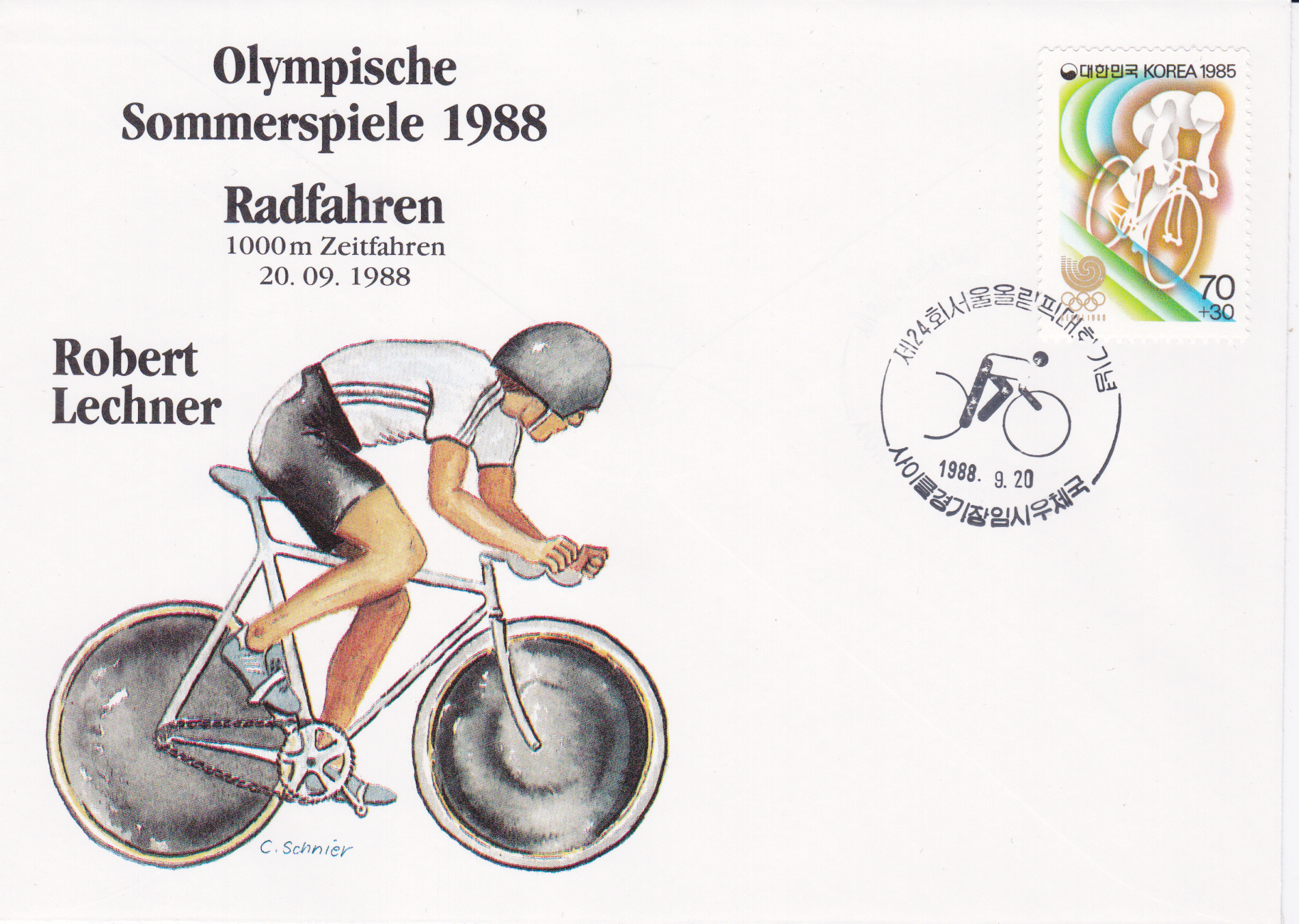 Ich beginne hier mal mit dem 20. September 1988. An diesem Tag fand das 1000m-Zeifahren auf der Bahn statt. Robert Lechner (geb. 22. Jan. 1967 in Bruckmühl) hat dabei eine Bronzemedaille erreicht. Mit dem Sonderstempel "Radfahren" kann dieser 3. Platz dokumentiert werden