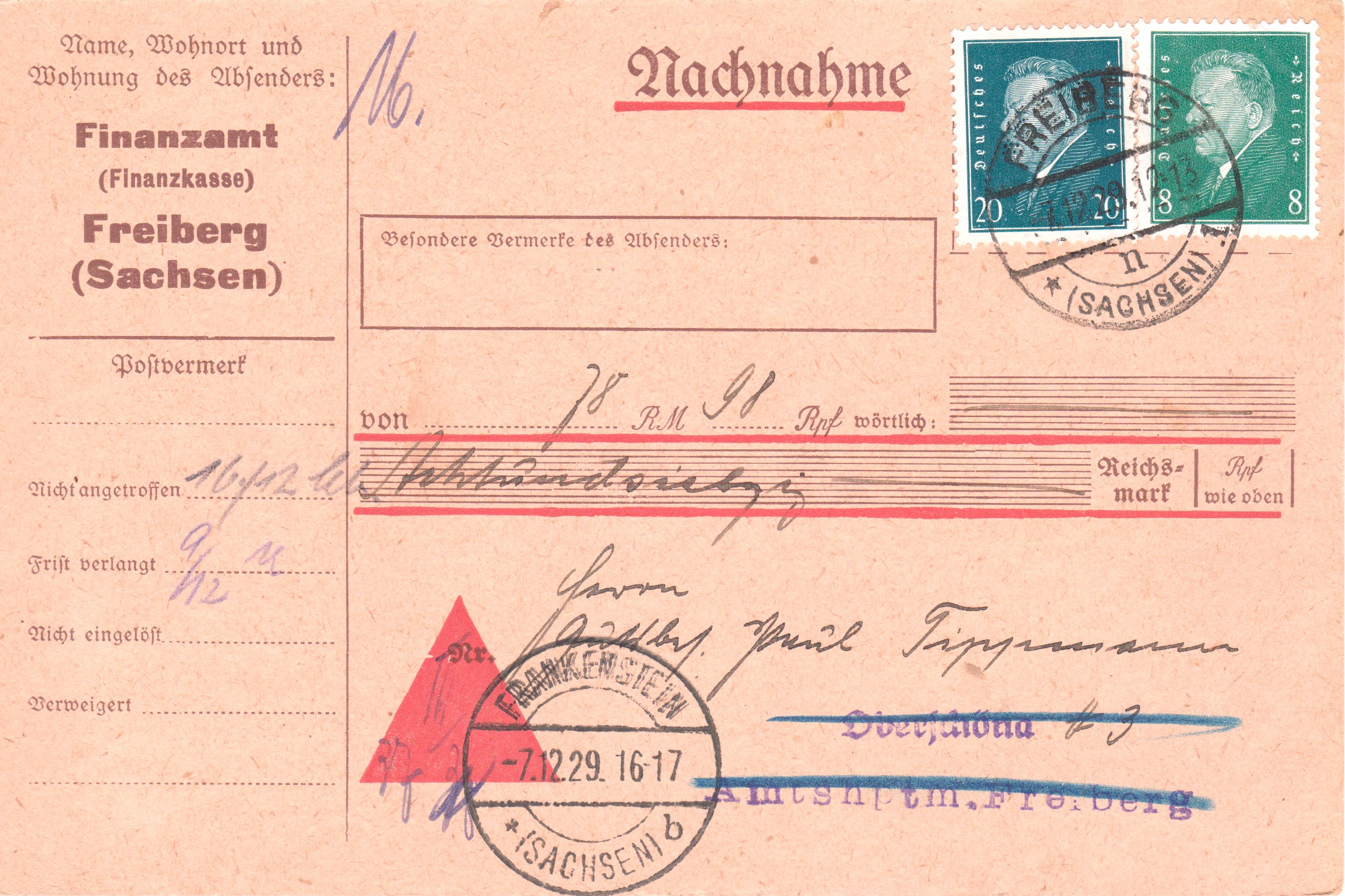 Nachnahme in Kartenform, aufgegeben im Dezember 1929 in FREIBERG (SACHSEN):