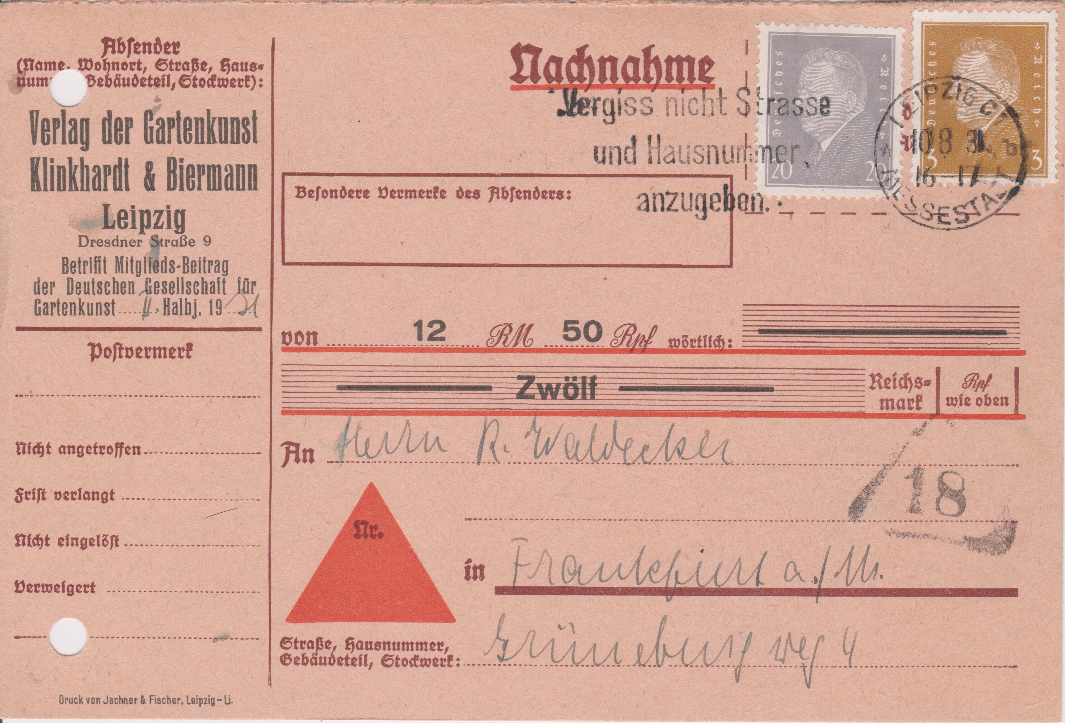 Drucksache, Porto 3 Pf, per Nachnahme, Porto 20 Pf, ergibt die Portotufe 23 Pf, hier am 27.09.1929 dargestellt als Mischfrankatur der Freimarken Reichspräsidenten, 15 Pf Hindenburg sowie 8 Pf Ebert: