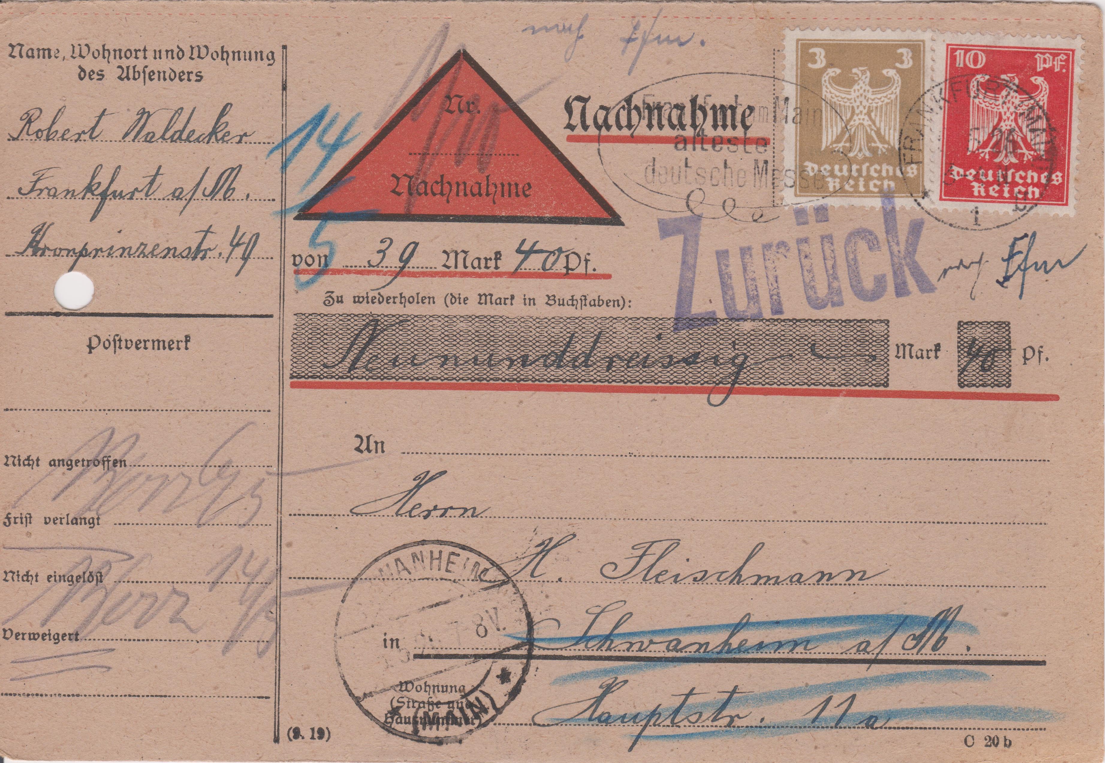 Einzelfrankatur der Wertstufe 40 Pf am 14.03.1925 auf Brief, Porto 10 Pf, "Durch Eiboten", Porto 30 Pf, von MANNHEIM nach Heidelberg, den dort der Eilbote "13" dem Empfänger zustellte: