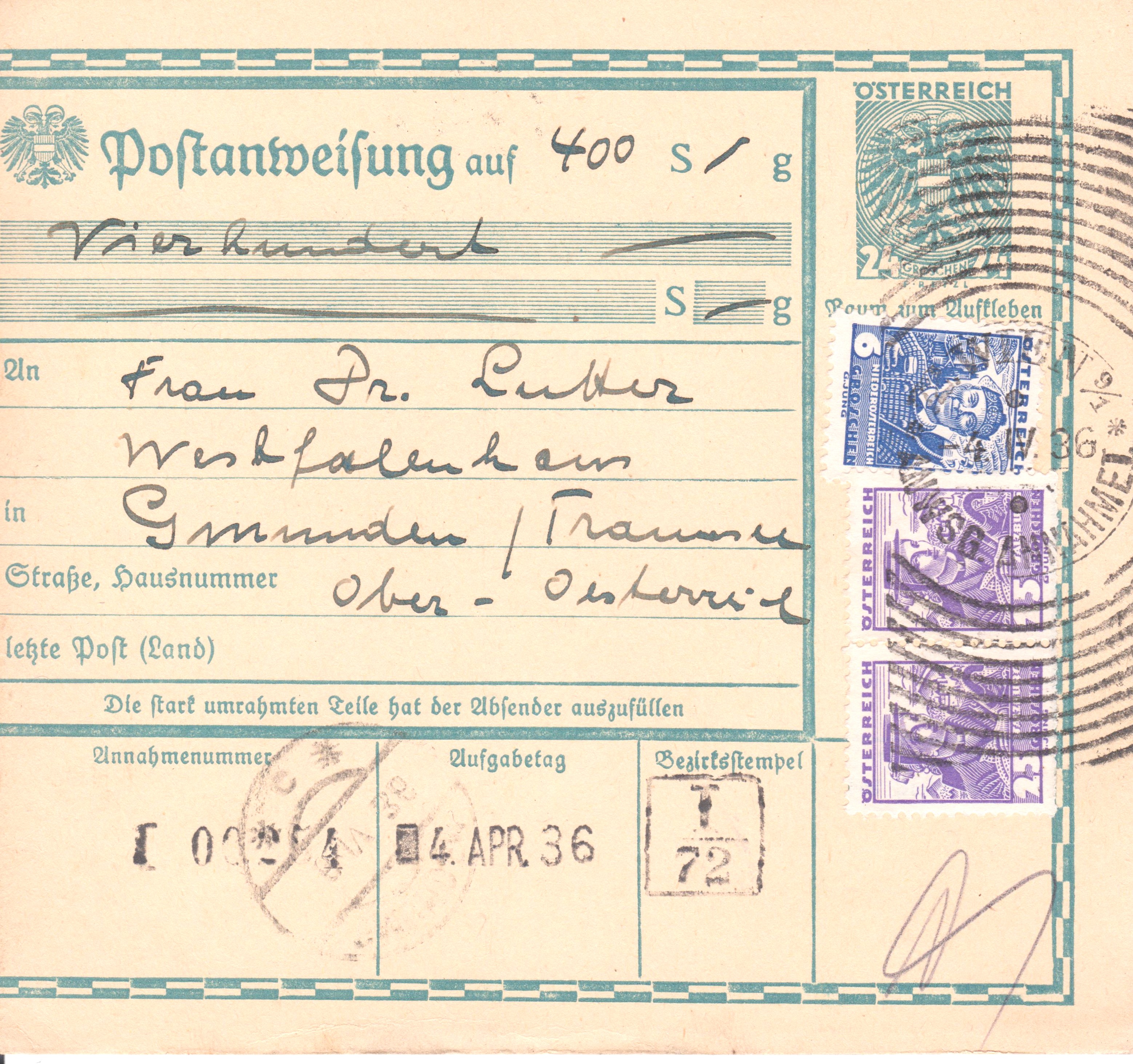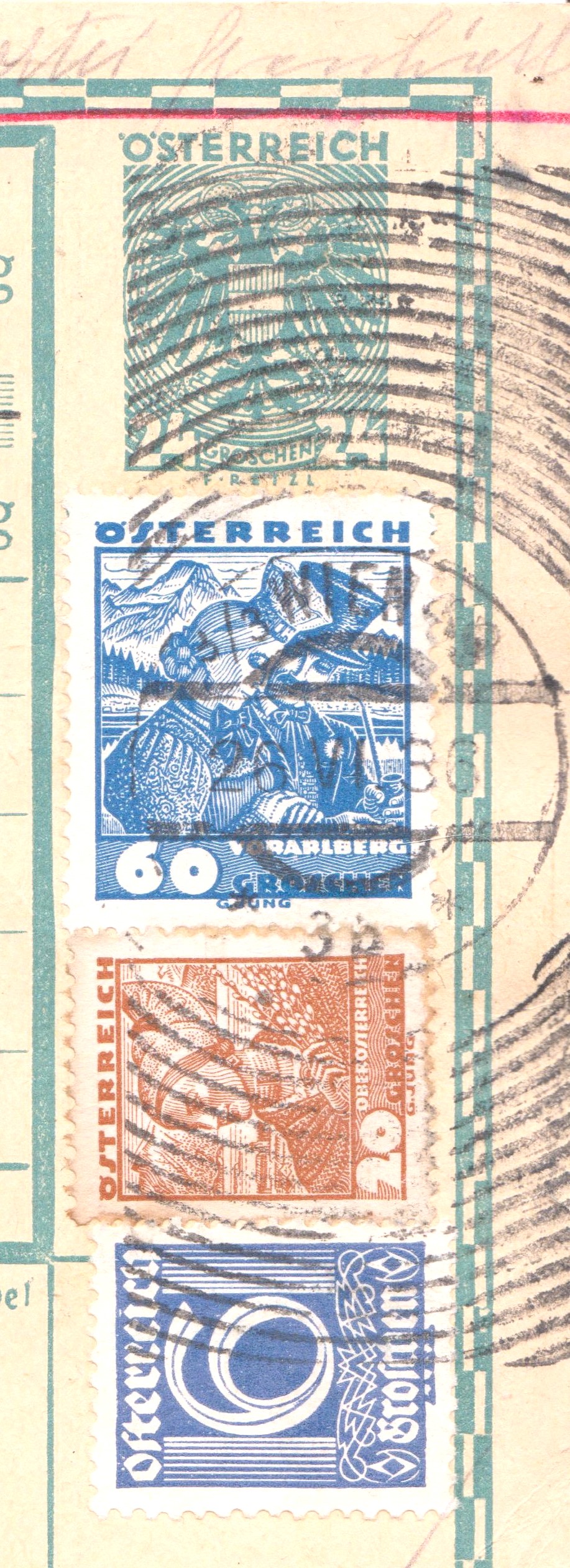 Der auffällige Stempelabschlag stammt von einer Handstempelmaschine zur Bearbeitung von Postanweisungen, wie sie in Österreich und den K.u.k.-Nachfolgestaaten ab Ende 1902 verwendet wurden.
