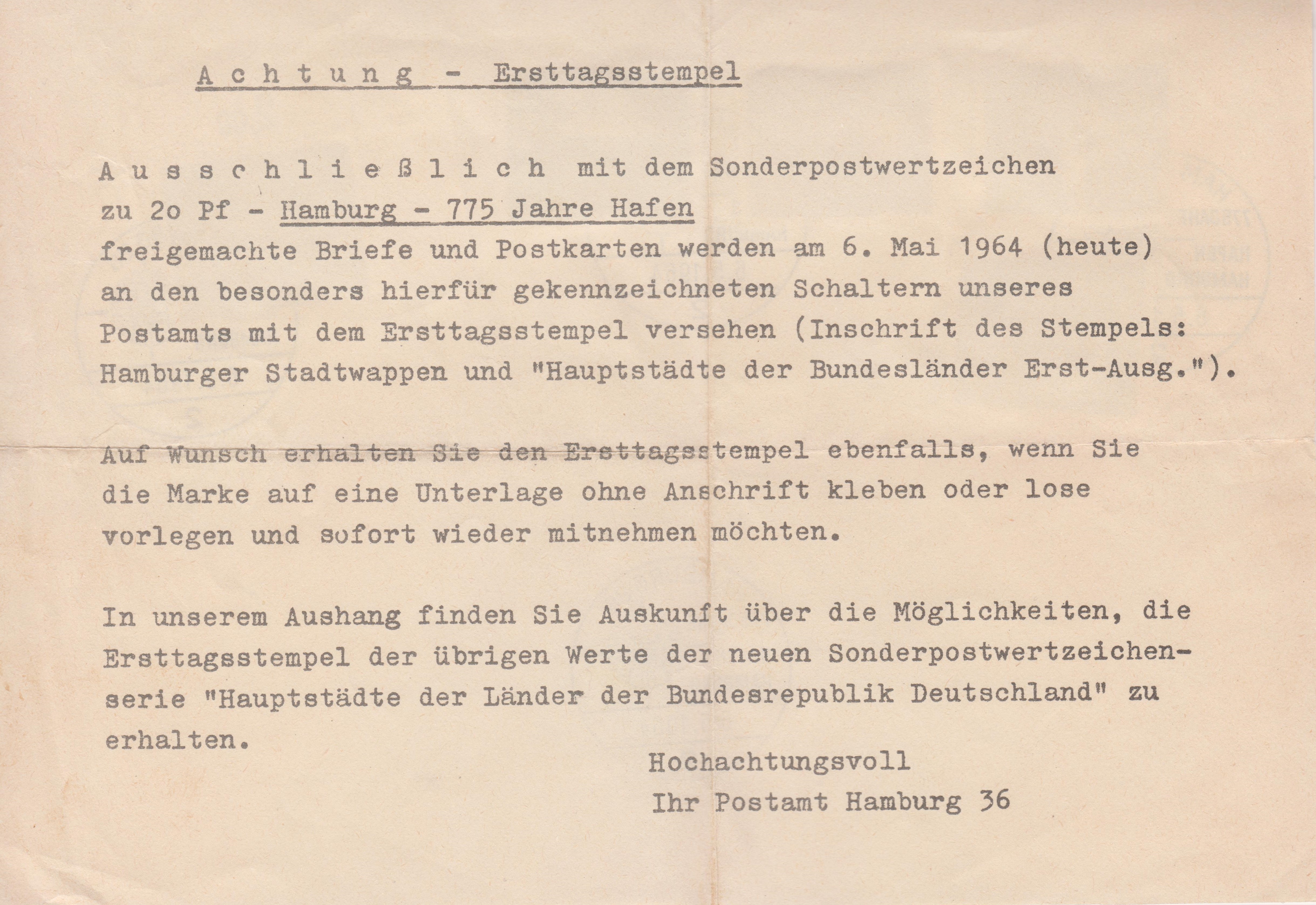 Hier eine interessante Stempelvorlage aus HAMBURG vom 06.05.1964 zu diesem Thema mit Sonderstempel aus HAMBURG 36: