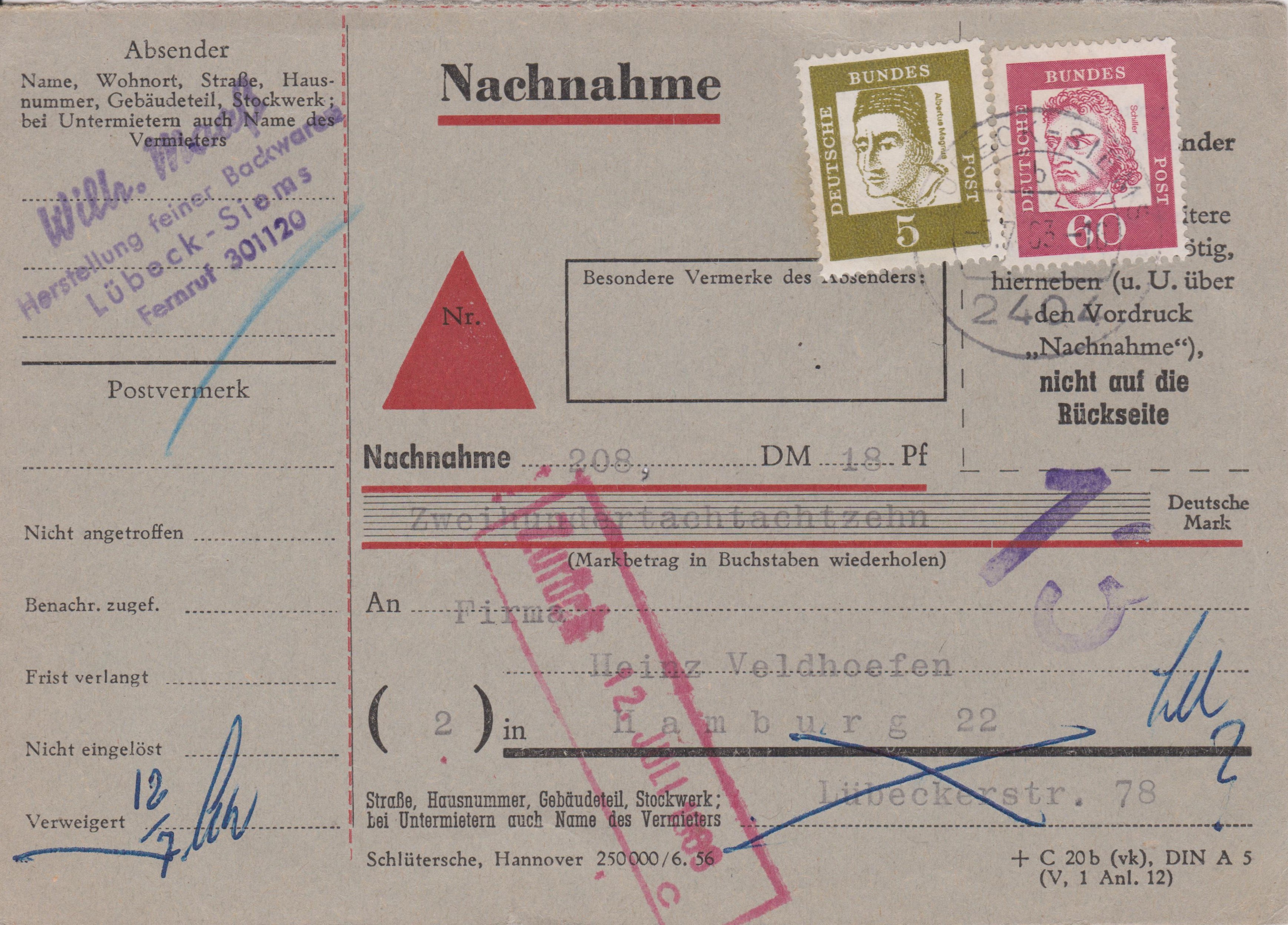 Postkarte im Fernverkehr von LÜBECK-SIEMS nach Hamburg, Portostufe 15 Pf, per Nachnahme, Porto 50 Pf, am 05.07.1963 freigemacht per Mischfrankatur Dauerserie Bedeutende Deutsche 60 Pf sowie 5 Pf: