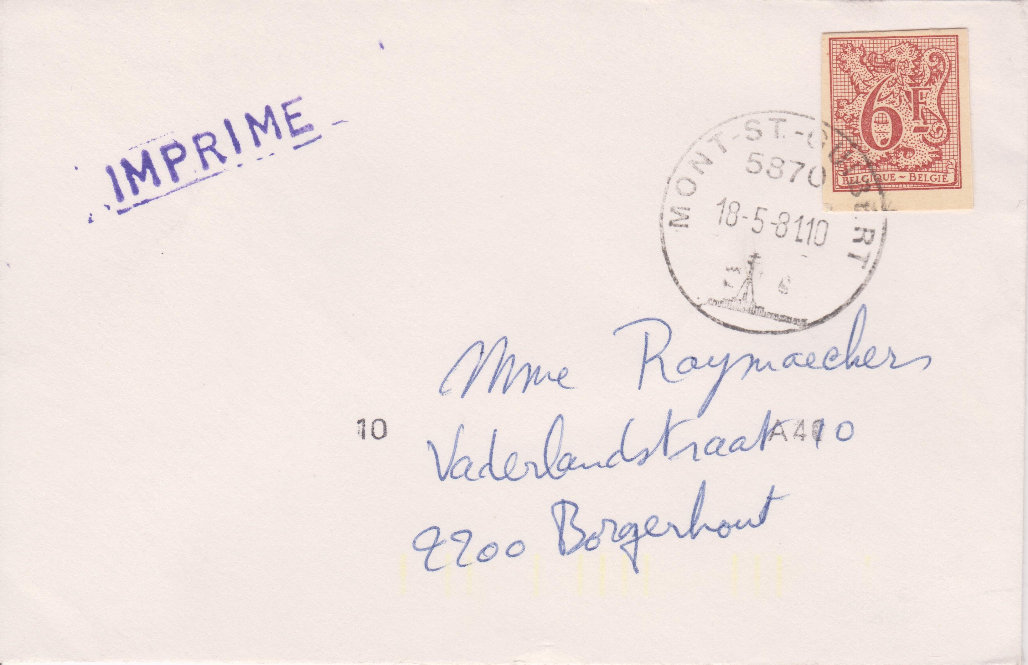 Ganzsachenausschnitt 6 F aus einer belgischen Ganzsache, verwendet am 18.05.1981 auf Inlandsdrucksache ab MONT-ST.-GUIBERT: