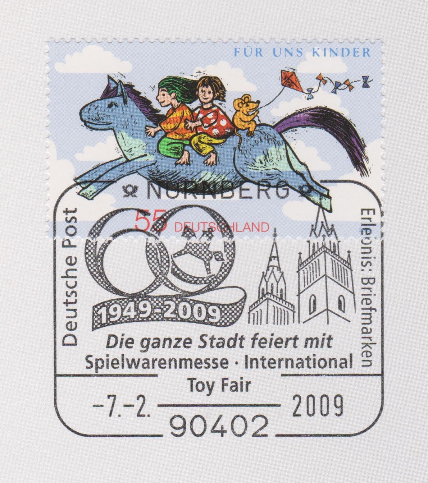 In der Stempelsammlung 2009 auf Blatt 7 findet man die Briefmarke "Für uns Kinder 2008", Blaues Pferd, mit dem Sonderstempel vom 07.02.2009 "60 Jahre Spielwarenmesse Nürnberg" mit einem Schaukelpferd: