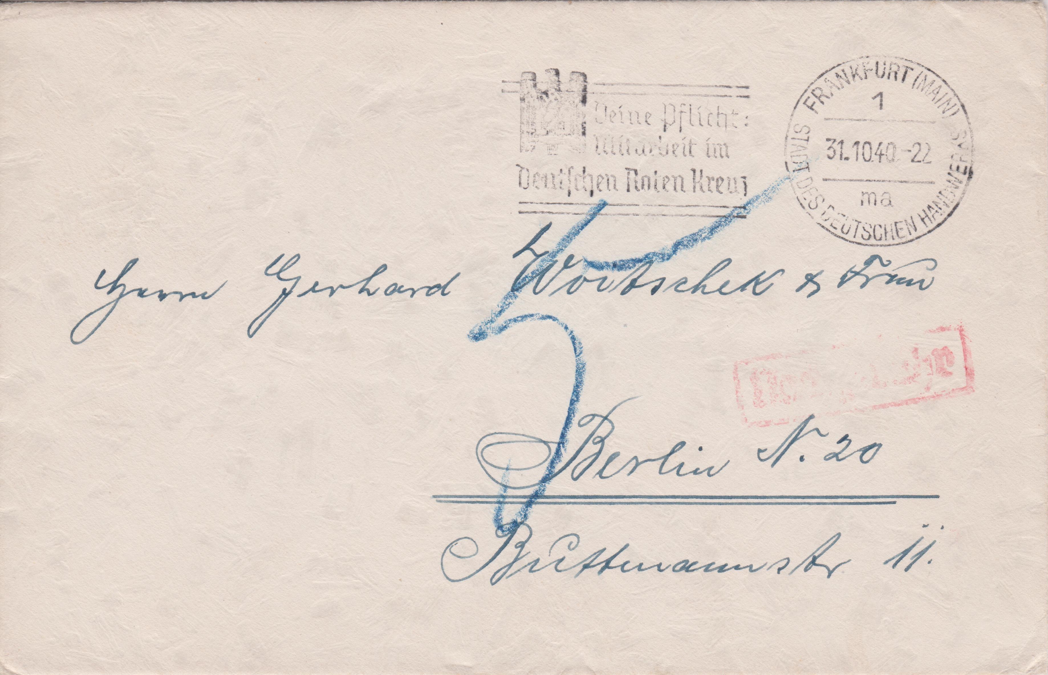 Dieser nach Berlin N 20 adressierte Beleg wurde unfrankiert in Frankfurt aufgegeben und am 31.10.1940 um 22 Uhr per Maschinenstempel FRANKFURT (MAIN) 1 ma STADT DES DEUTSCHEN HANDWERKS gestempelt:
