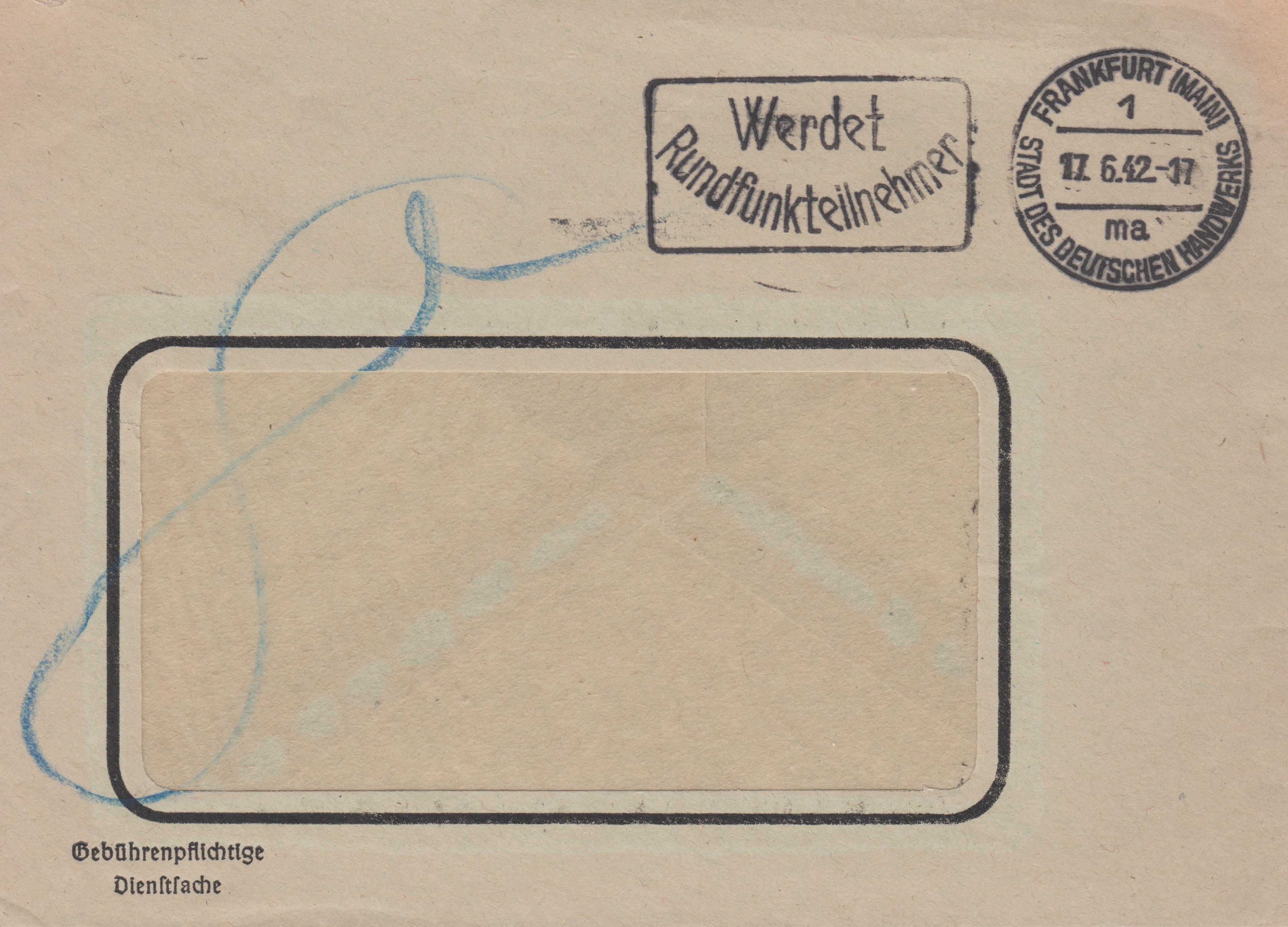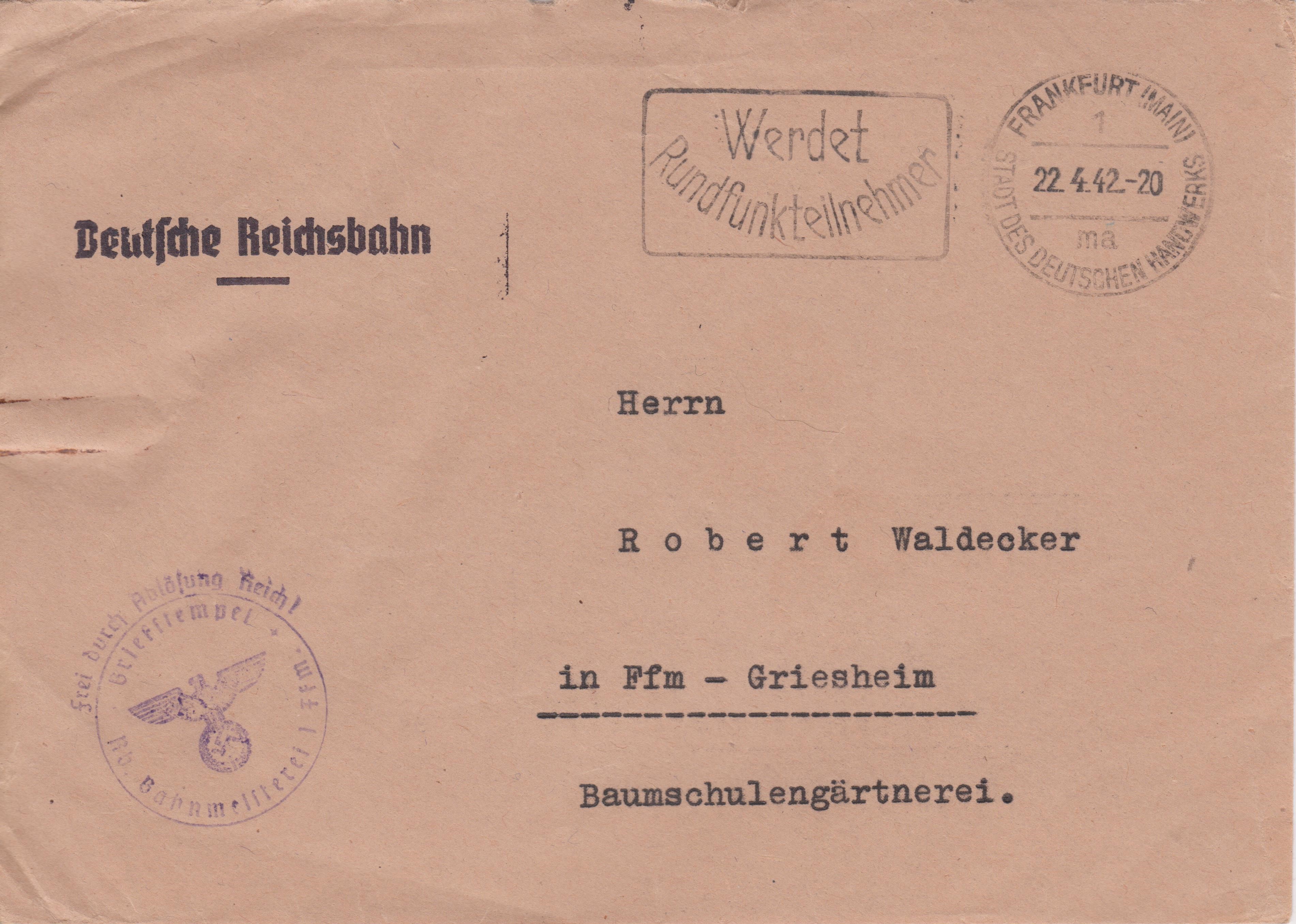 Brief mit Eindruck des Absenders "Deutsche Reichsbahn" sowie Stempel "Frei durch Ablösung Reich!" mit Maschinenstempel FRANKFURT (MAIN) 1 ma STADT DES DEUTSCHEN HANDWERKS mit Werbeeinsatz "Werdet Rundfunkteilnehmer":