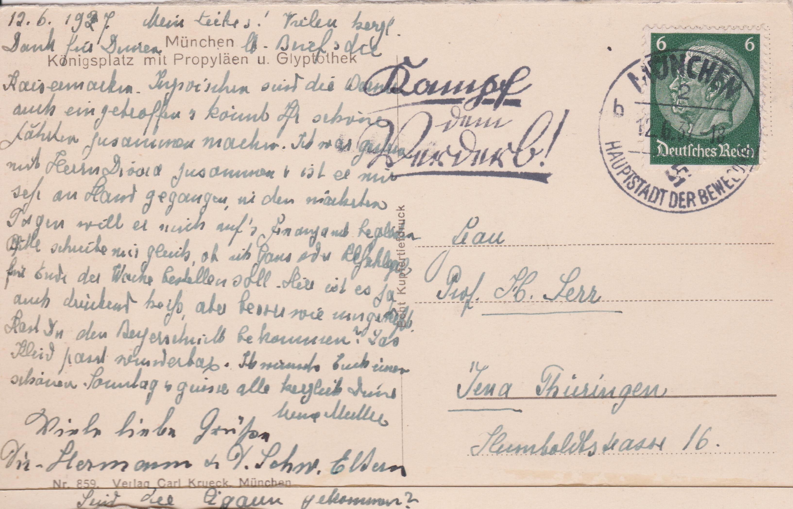 Postkarte im Fernverkehr, Portostufe 6 Pf, freigemacht per Einzelfrankatur Dauerserie Hindenburg-Medaillon, entwertet per Maschinenstempel MÜNCHEN 2 b HAUPTSTADT DER BEWEGUNG mit Propaganda-Werbeeisatz in Sütterlinschrift "Kampf dem Verderb!":