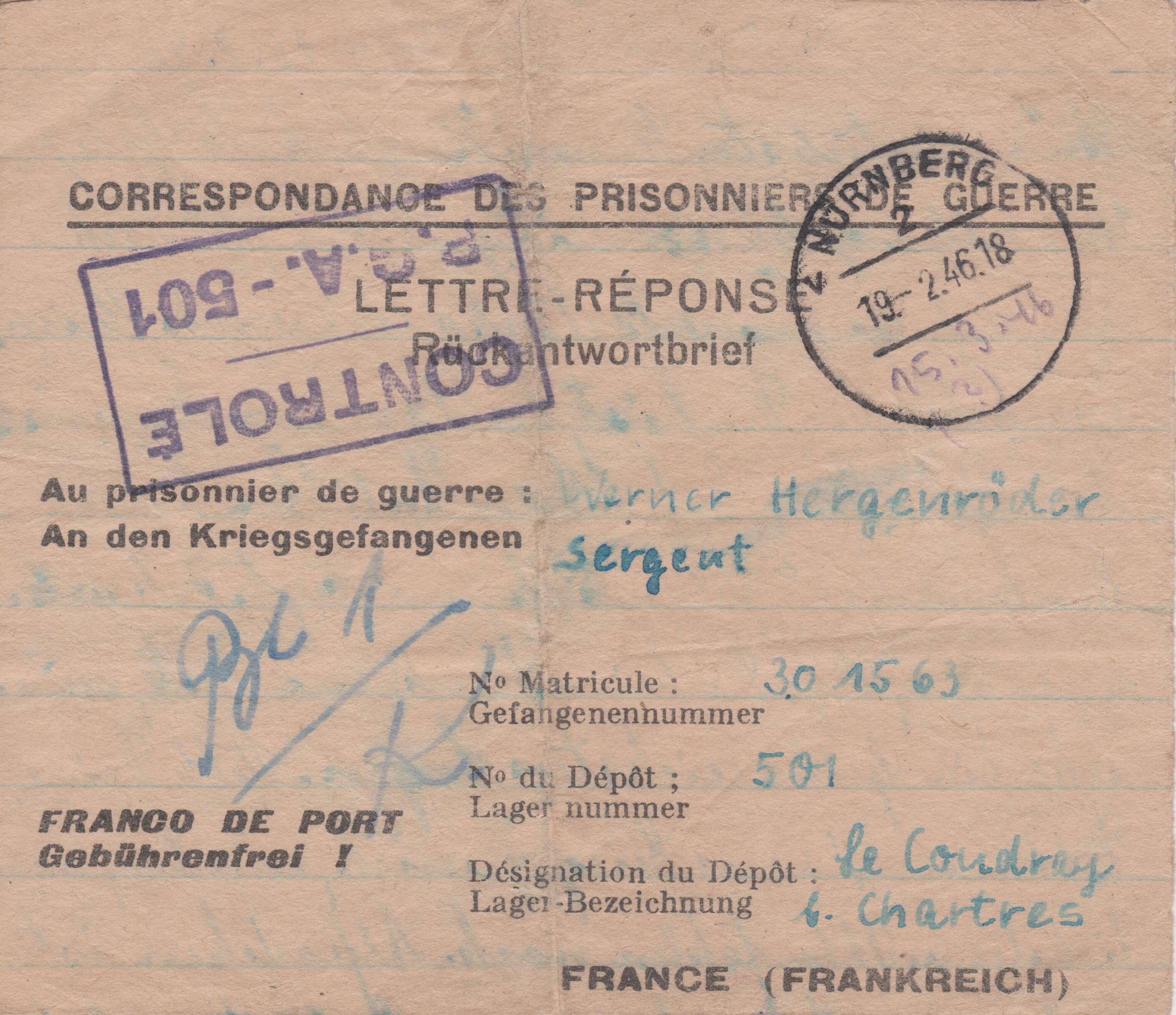 Gebührenfreier Rückantwortbrief an einen in Frankreich Kriegsgefangenen "Sergeant Werner Hergenröder", aufgegeben am 19.02.1946 in NÜRNBERG: