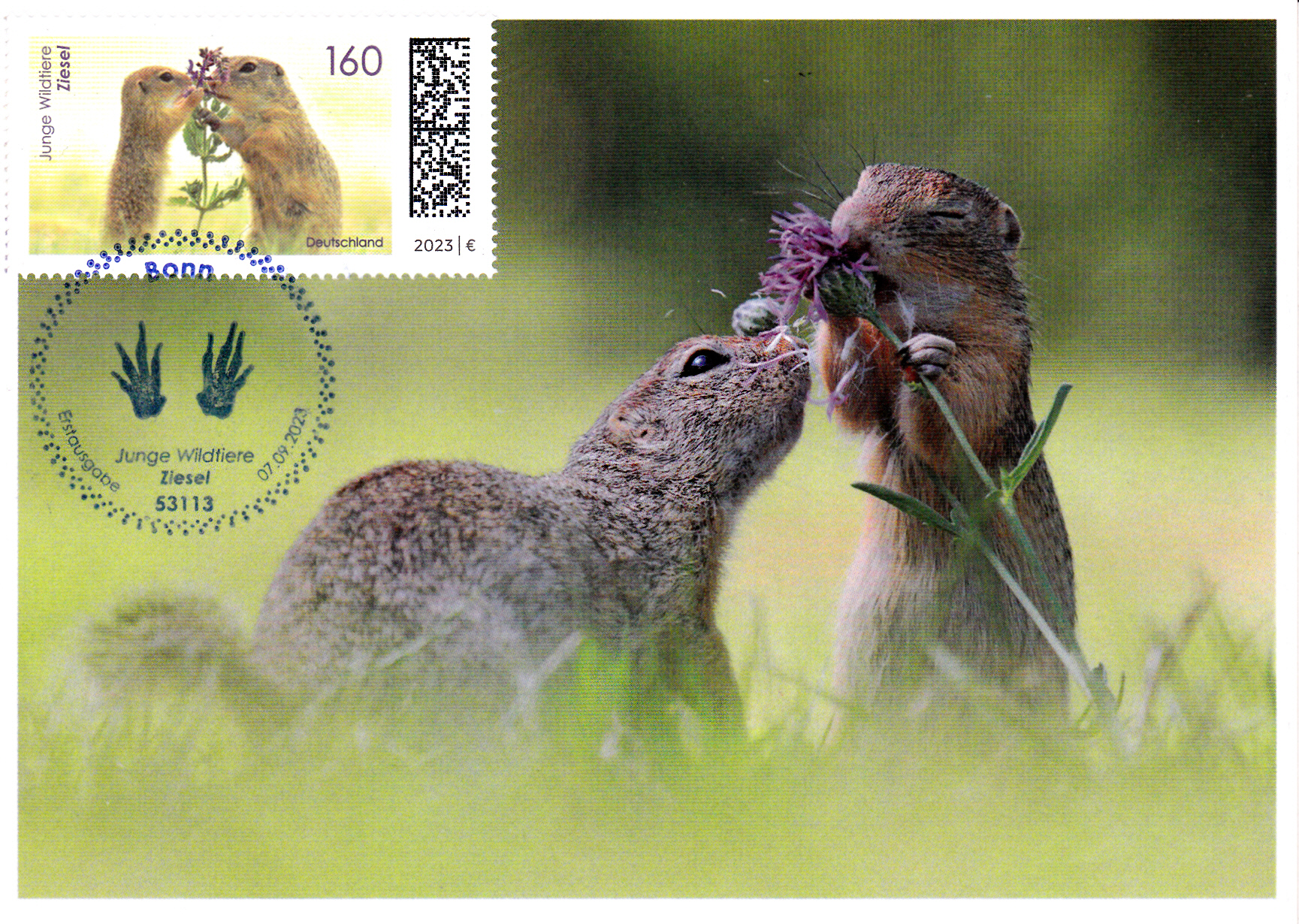 Klappkarte des Vorstandsvorsitzenden der Deutschen Post AG mit einer Marke (MiNr 3782) mit dem Motiv "Zwei Europäische Ziesel (Spermophilus citellus)" aus der Serie "Tierbabys" und dem Ersttagsonderstempel Bonn.