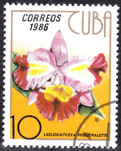 Eine Marke aus Cuba (MiNr 3039) bildet eine Blüte einer Laeliocattleya "prism palette" ab.