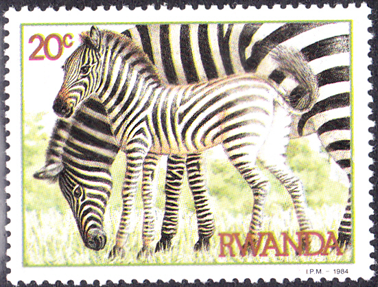Ein Zebra mit einem jungen Zebra zeigt uns diese Marke aus Ruanda (MiNr 1283).