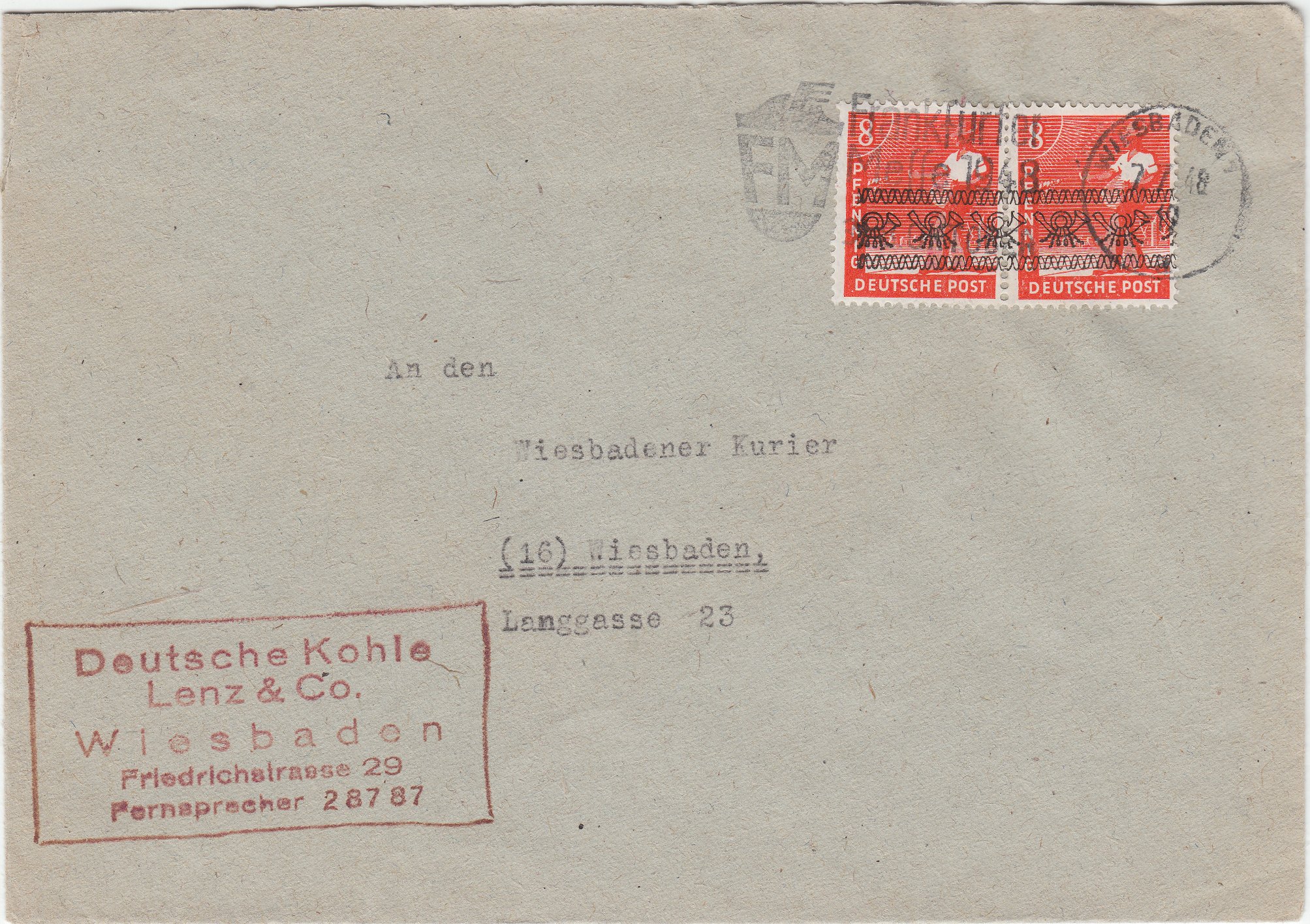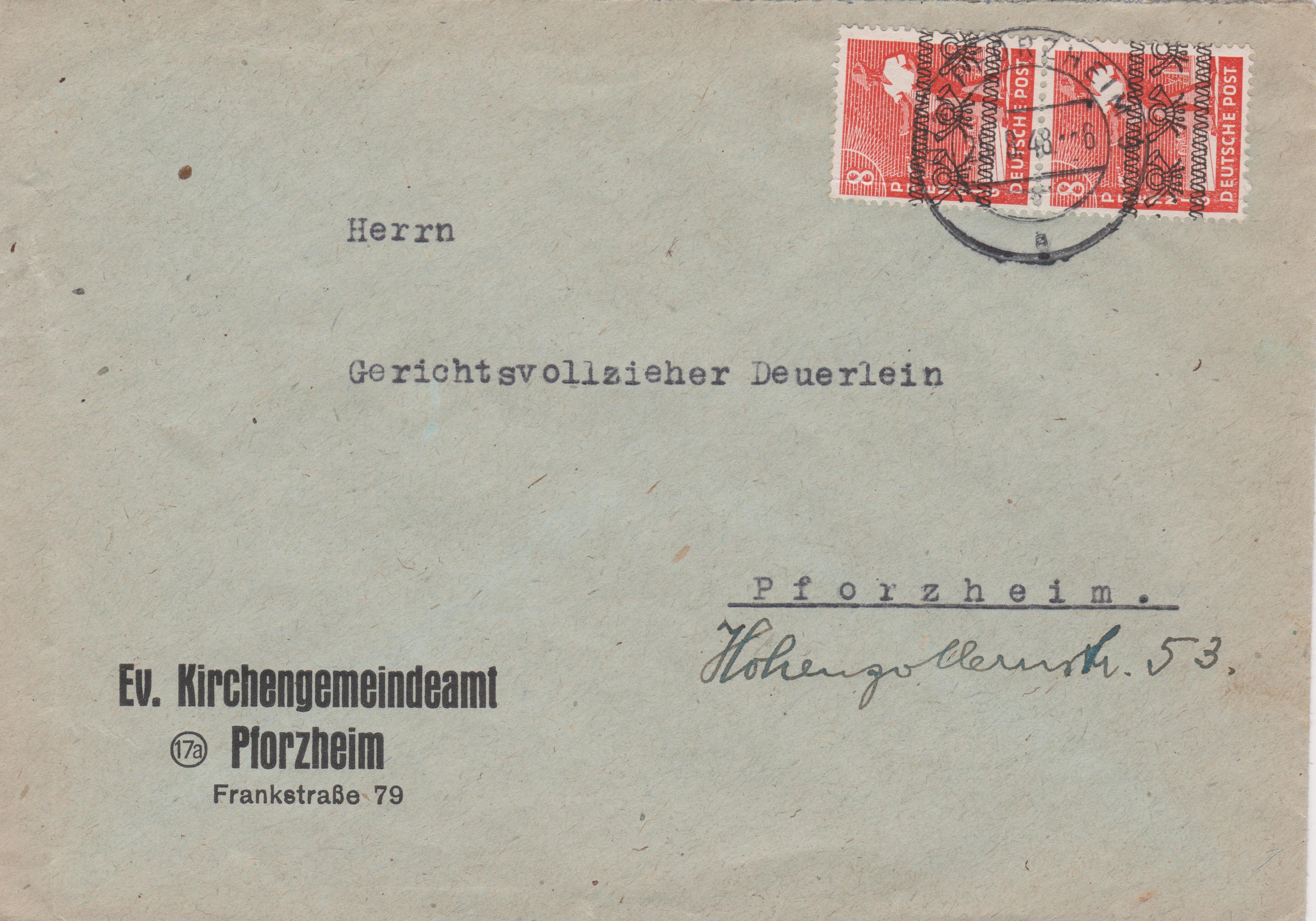 Bei diesem Beleg dürfte der Absender also wohl schlicht und einfach vergessen haben, eine zweite solche Marke zu 8 Pf zu verkleben, und die Post hat diese Unterfrankatur nicht bemerkt, denn sonst wären 12 Pf an Nachgebühr fällig geworden.