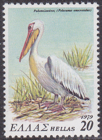 Aus Griechenland kommt diese Marke (MiNr 1376) kommt diese Marke mit einem Rosapelikan (Pelecanus onocrotalus).