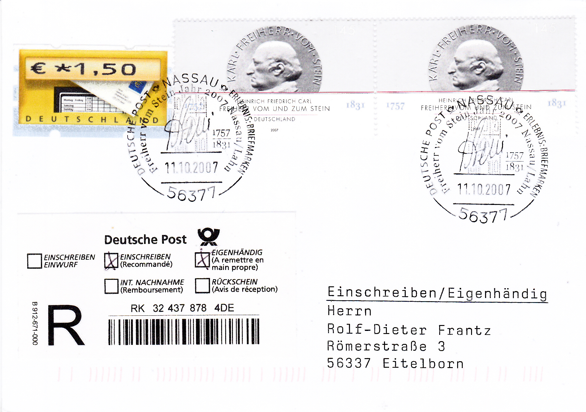 Zum 250. Geburtstag von Karl Freiherr vom und zum Stein erschien bei der Deutschen Post eine Marke (MiNr 2624). Sie zeigt eine Porzellan-Plakette von Richard Scheibe mit einem Porträt von Karl Freiherr vom und zum Stein.