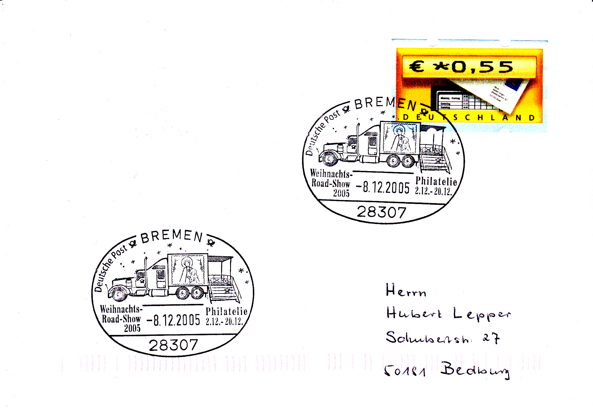 Die Weihnachts-Road-Show war dann offensichtlich am 8.12.2005 in 28307 Bremen, wie dieser Sonderstempel belegt.