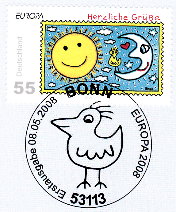 Farbige Ministerkarte des Bundesministers für Finanzen im ungewöhnlichen Querformat mit je einer Marke der Serie "Post:Grußmarken" (MiNr 2644/2645 und 2663) und der Europamarke (MiNr 2662) und den jeweils dazu gehörenden Ersttagsstempel Bonn und Berlin. Ungewöhnlich ist auch, dass zwei Marken am 7.2.2008 und die beiden anderen Marke erstam8.5.2008 erschienen sind. Die Gemeinsamkeit der vier Marken liegt darin sie alle nach Entwürfen von James Rizzi gestaltet wurden.