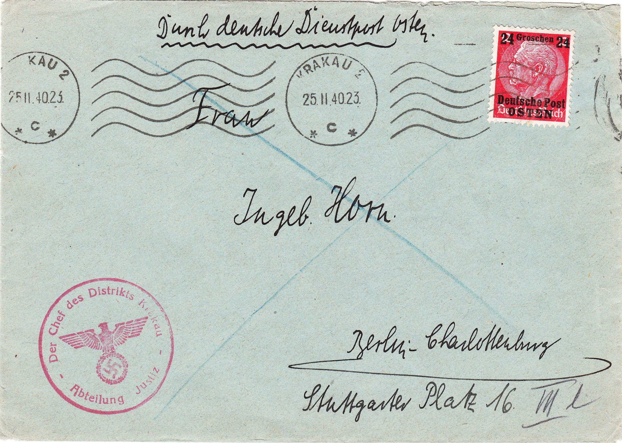 Hier ein Fernbrief, Porto 24 Groschen, aufgegeben am 25.11.1940 in Krakau: