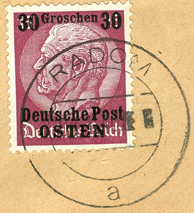 Und der Wertstempel (30 Groschen auf 15 Pfennig, bräunlichlila).