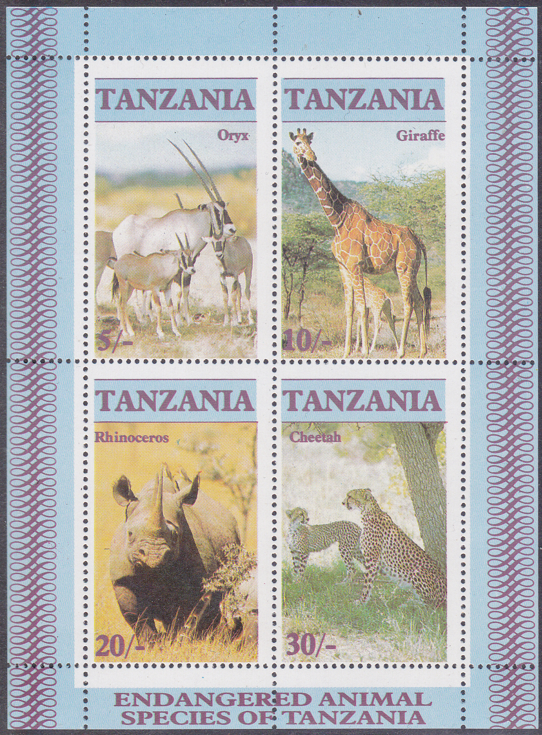 Die hier bereits bereits gezeigte Marke aus Tansania (MiNr 328) mit einem Spießbock (Oryx gazella) ist auch zusammen mit drei weiteren Marken in einem Block (MiNr Block 58) erschienen.