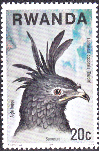 Auf einer Marke aus Ruanda (MiNr 893) wird der Kopf eines Schopfadler (Lophaetus occipitalis) abgebildet.