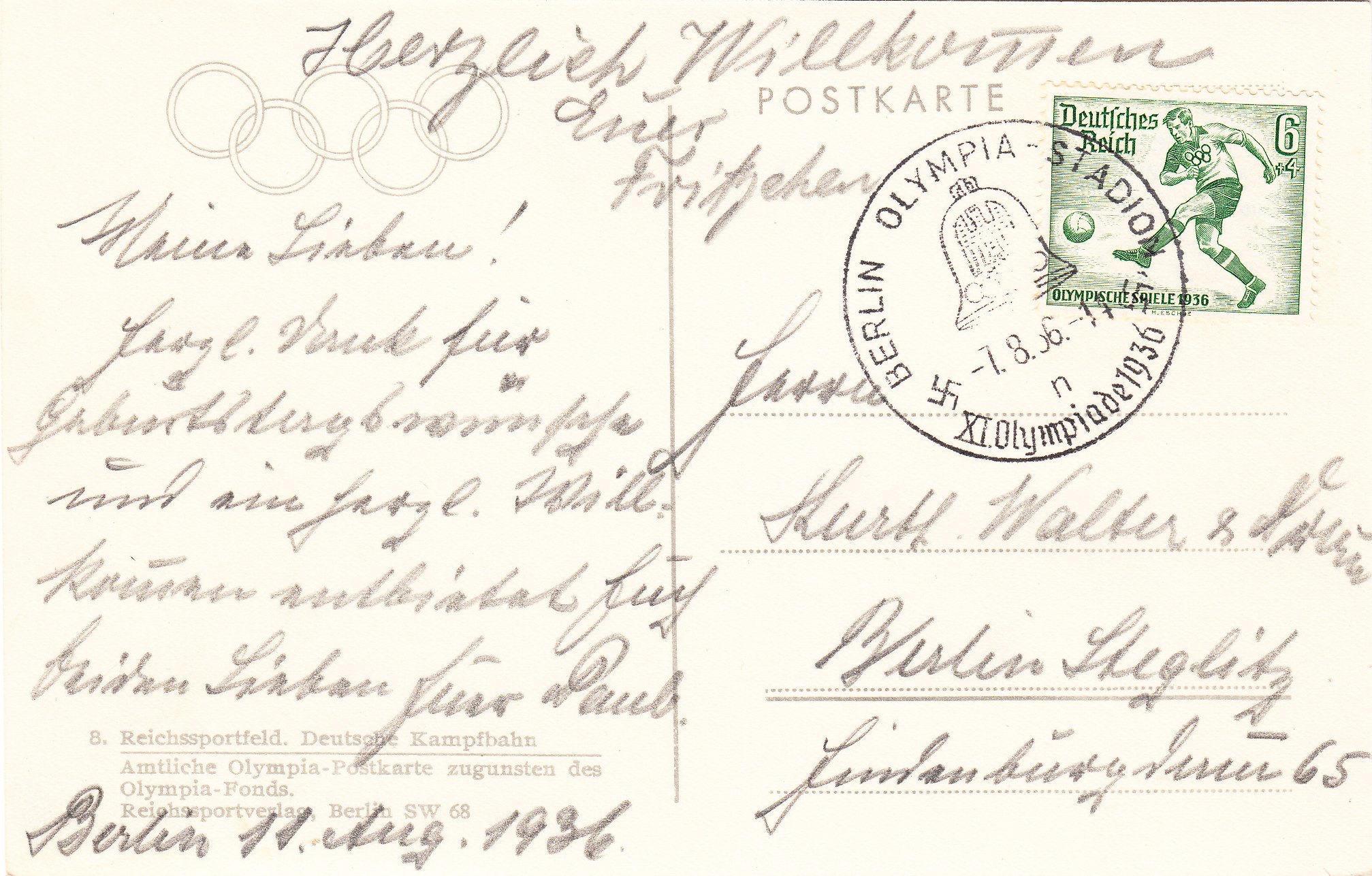 Hier ein Sonderstempel "BERLIN OLYMPIA - STADION" mit dem Kennbuchstaben "n" vom 07.08.1936: