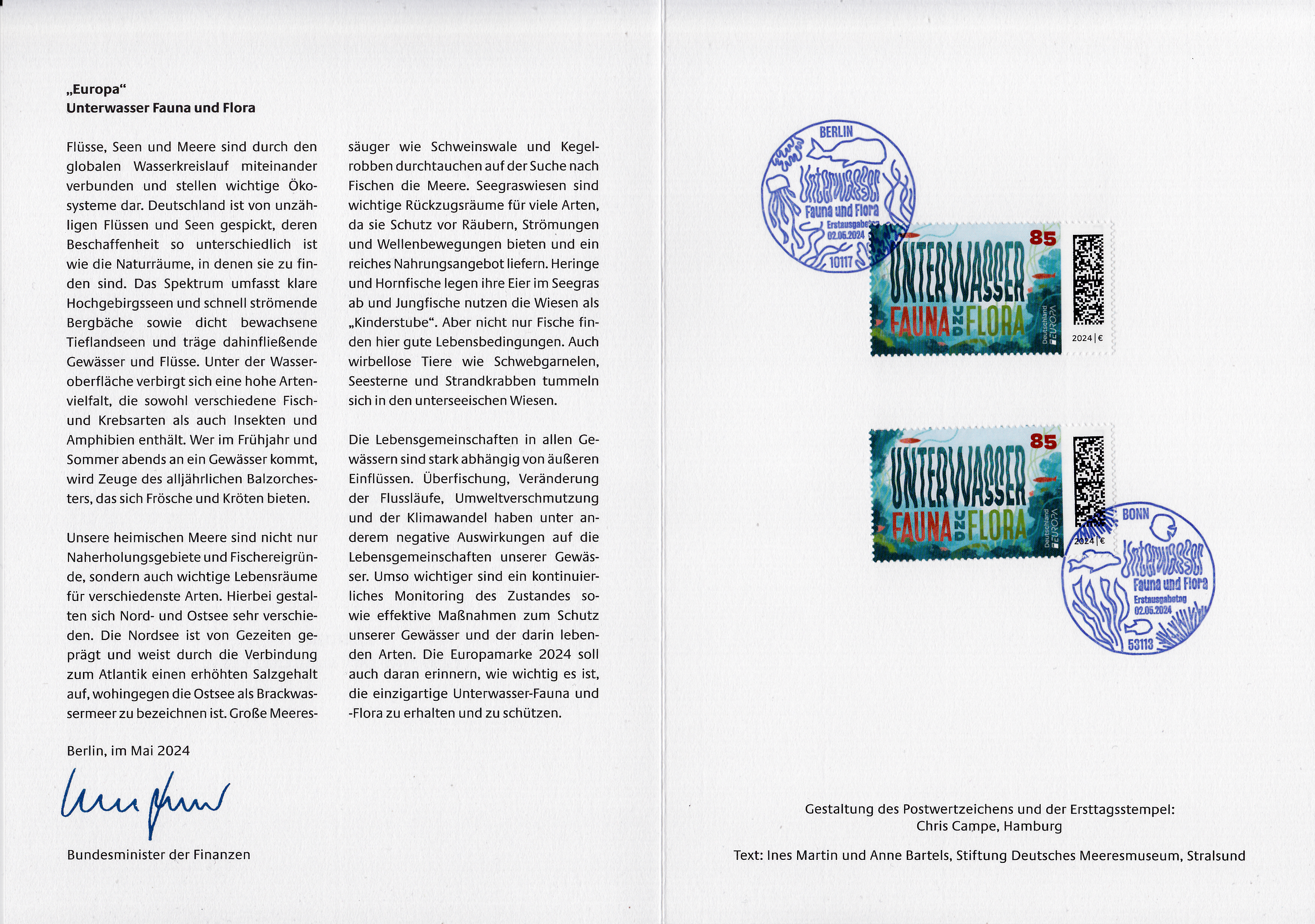 Ministerkarte des Bundesministers für Finanzen mit zwei Europamarken 2024 (MiNr 3828) zum Thema "Unterwasserfauna und -flora" und den beiden Ersttagsonderstempel Bonn und Berlin.