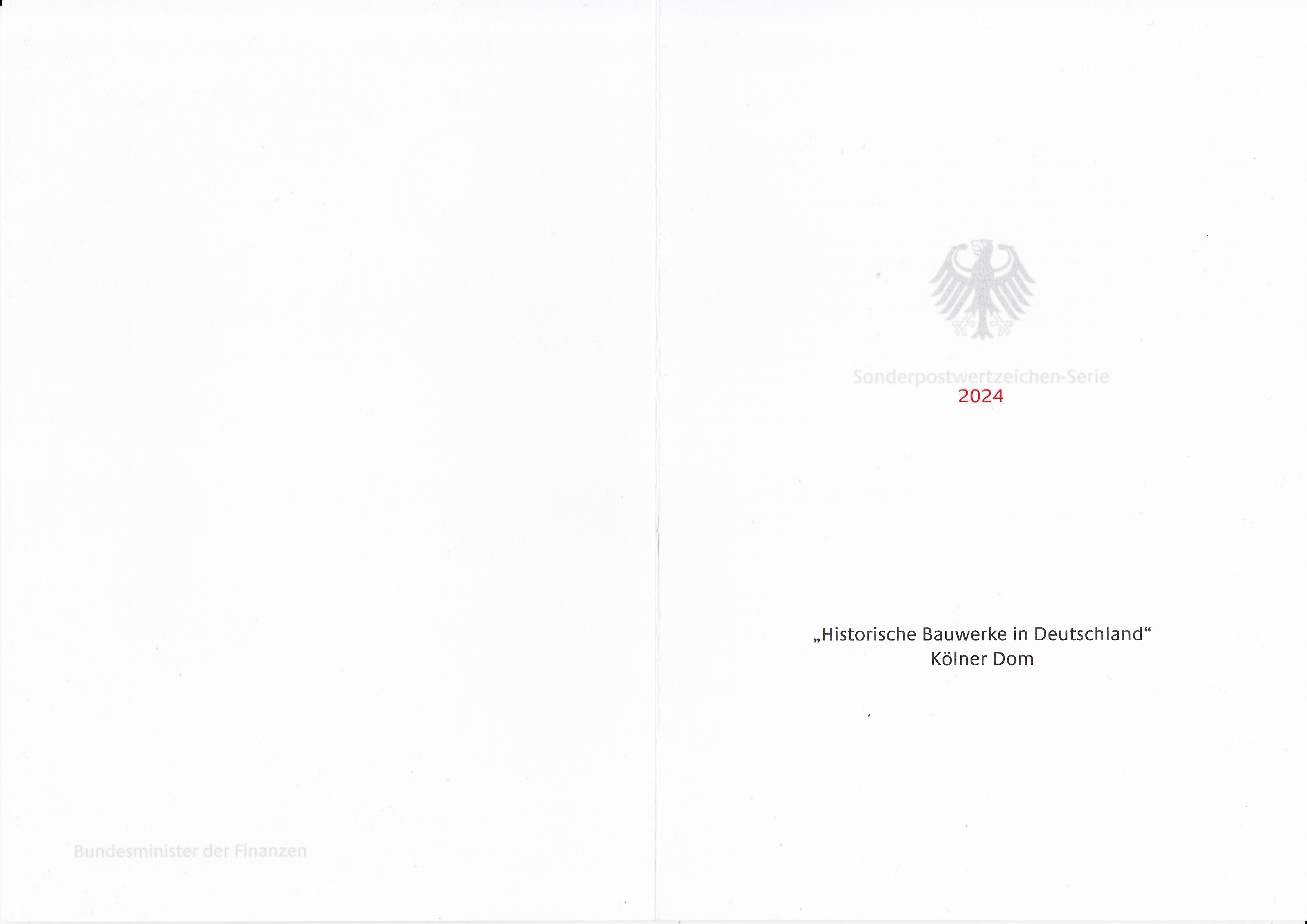 Ministerkarte des Bundesministers für Finanzen mit zwei Marken (MiNr 3832) aus der Serie "Historische Bauwerke in Deutschland" mit dem Motiv "Kölner Dom" und den beiden Ersttagsonderstempel Bonn und Berlin.