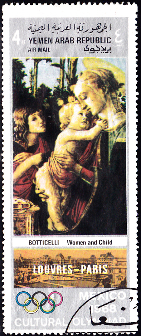 Eine Marke (MiNr 867) aus Jemen-Nord (Königreich) bildet einen Ausschnitt aus dem Gemälde "Madonna mit dem Kind und Johannes" von Sandro Botticelli ab.