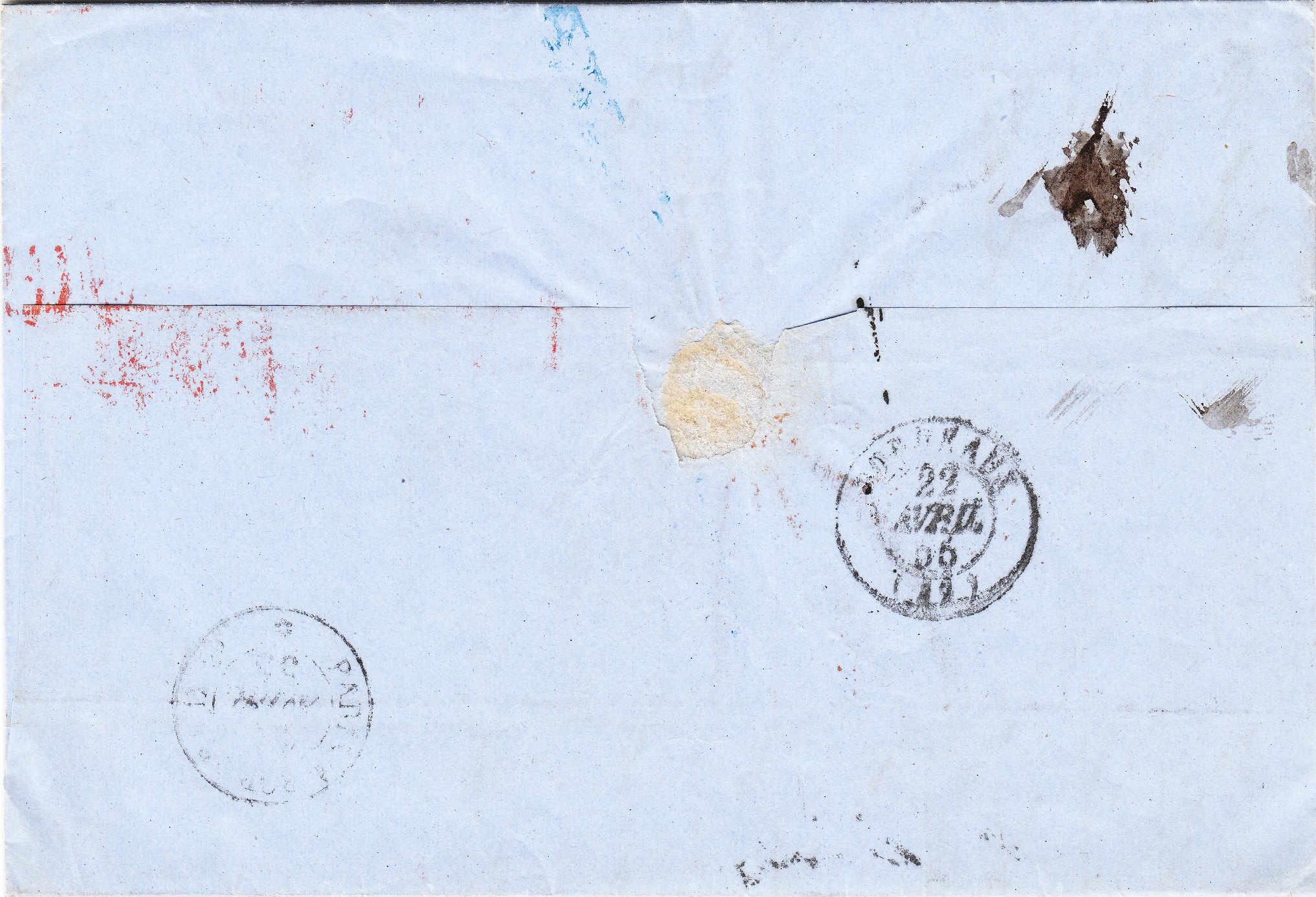 Der nach Paris adressierte Brief wurde am 22.07.1858 im im Zug III des Tages auf der Strecke BERLIN - MINDEN mitfahrenden Eisenbahnpostbüro aufgegeben und trägt daher den eigentlich wie auf der Rückseite abgeschlagen dreizeiligen Kursstempel als Aufgabestempel, bei dem vorderseitig als Aufgabestempel jedoch der untere Teil abgedeckt wurde, um "BERLIN" als Aufgabeort zu dokumentieren: