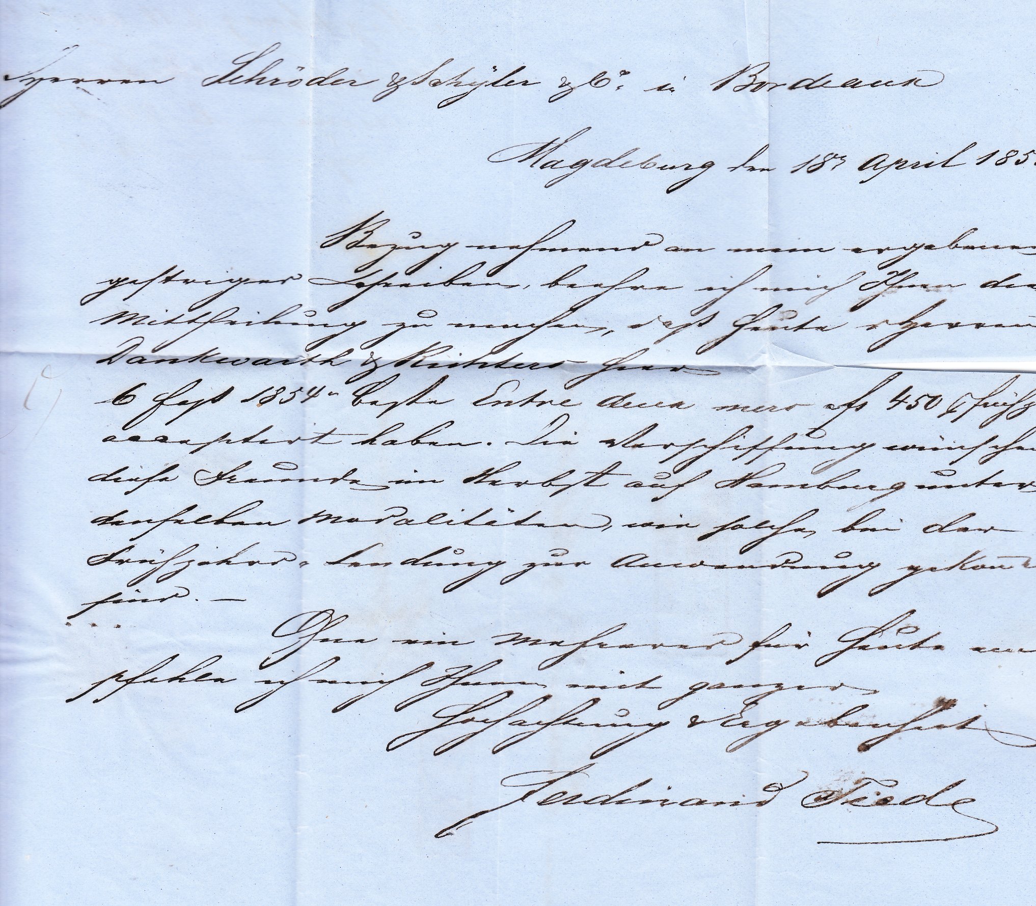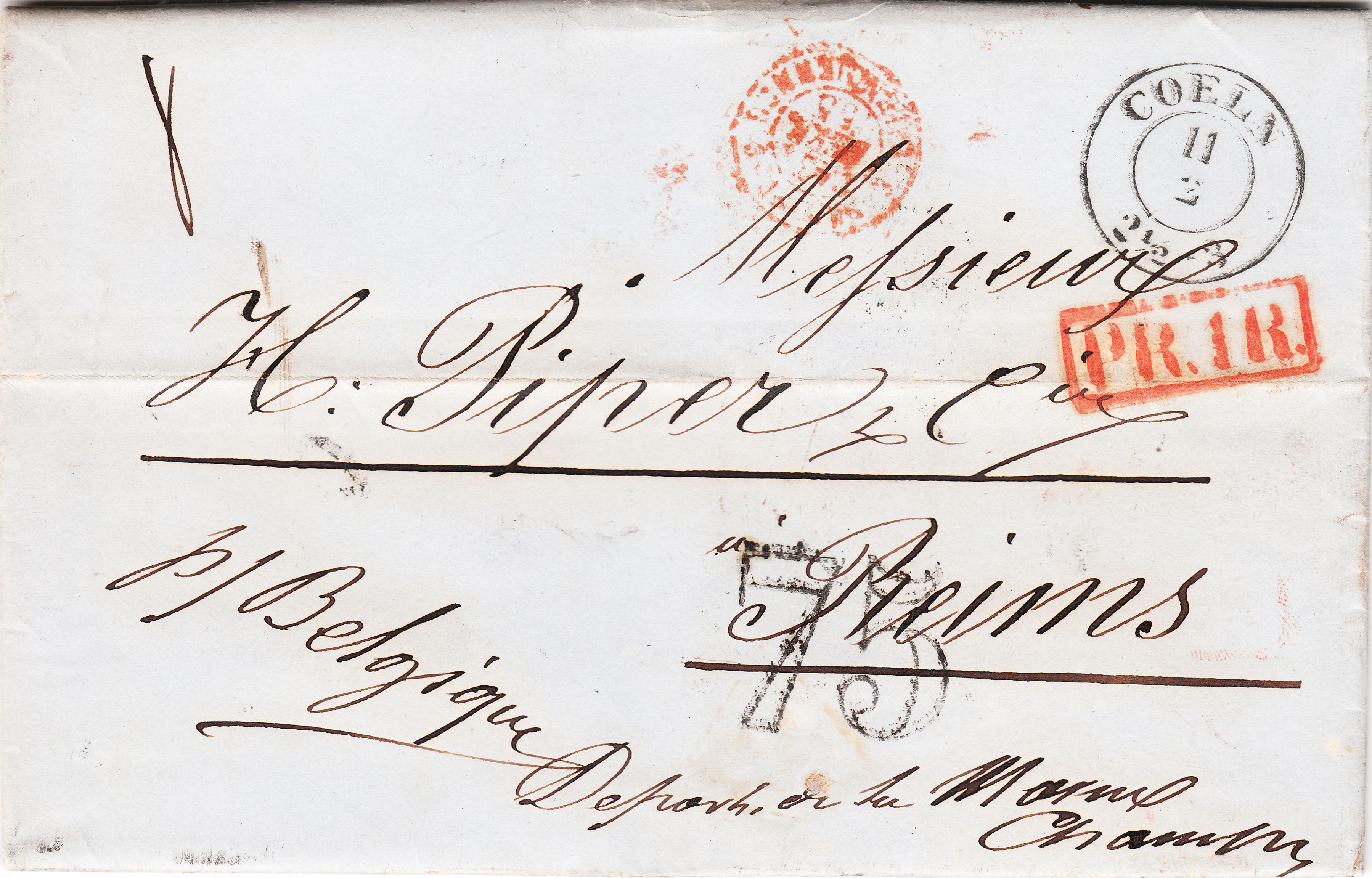 Der französische Anteil der Gebühr betrug 25 Centimes für einen Brief bis 7,5 Gramm plus 5 Centimes für den Transit durch Belgien. Es wurde eine Gewichtsprogression angewendet. Um auf die Gesamtsumme von 18 Decimen = 180 Centimes zu kommen muß man die 30 Centimes mal 3,5 nehmen, was einem Gewicht von 26 bis 30 Gramm entsprechen sollte, und der französische Gebührenanteil errechnet sich zu 105 Centimes.