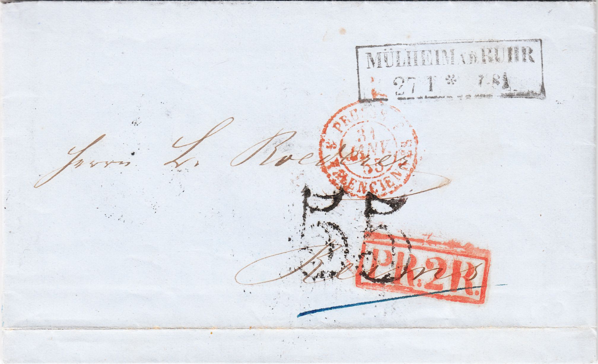 Oben links könnte in Blau als Gewicht in Preußen "2 Loth" vermerkt worden sein. Ein preußisches Lot waren 16 2/3 Gramm. Daneben könnte das Vereinsporto in Höhe von 3 Silbergroschen pro Loth vermerkt worden sein.