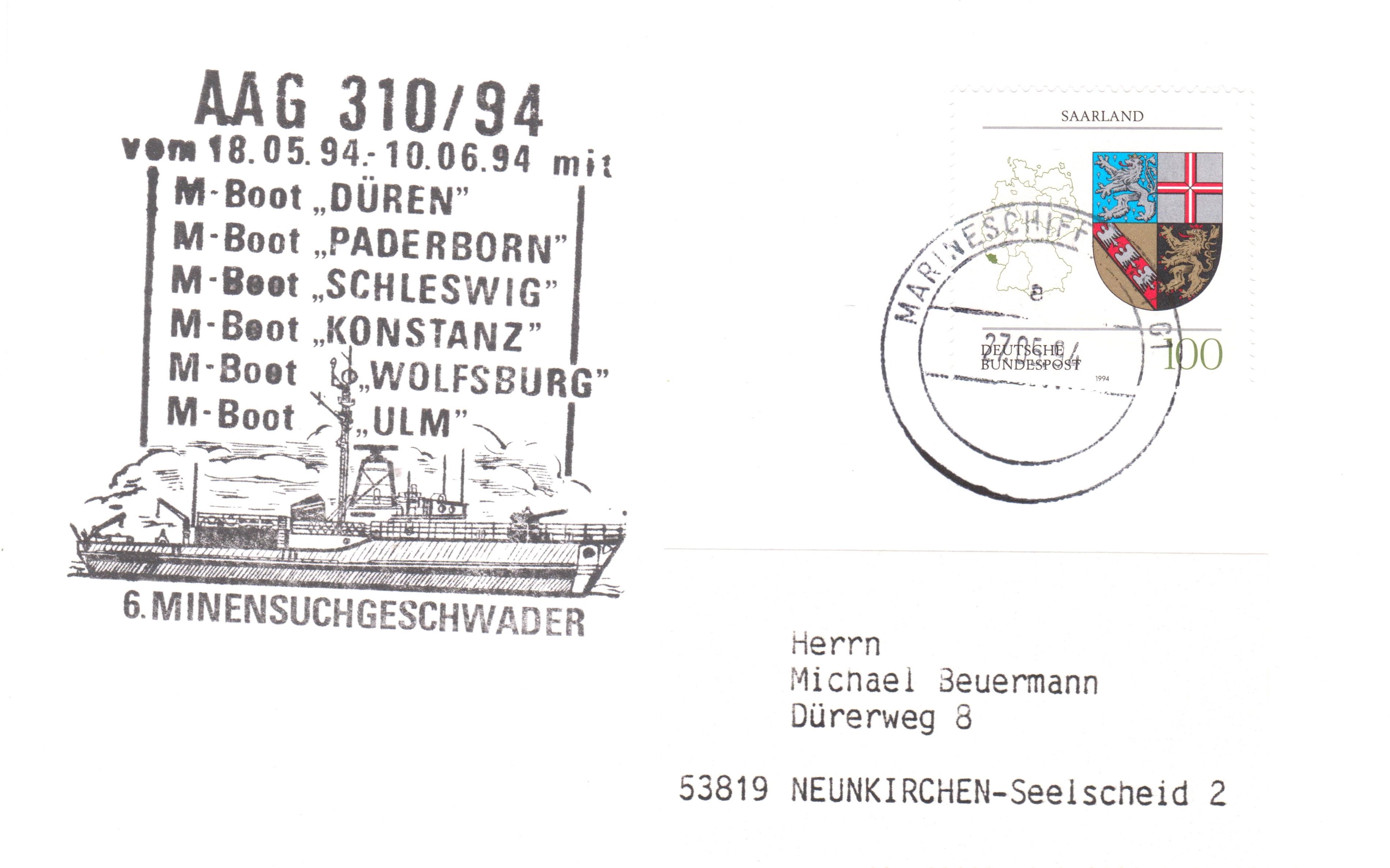 Dieser Beleg vom 27.05.1994 dokumentiert die Übung "AAG 310/94" vom 18.05.9904 bis 10.06.1994, an der das 6. MINENSUCHGESCHWADER mit sechs Minensuchbooten teilnahm: