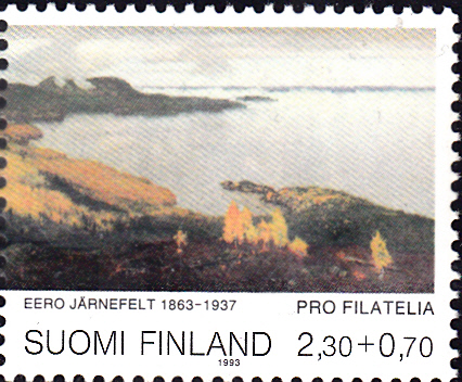Auf dieser Marke aus Finnland (MiNr 1200) wird ein Teil des Gemälde "Herbstlandschaft am Pielisjärvi" gezeigt.
