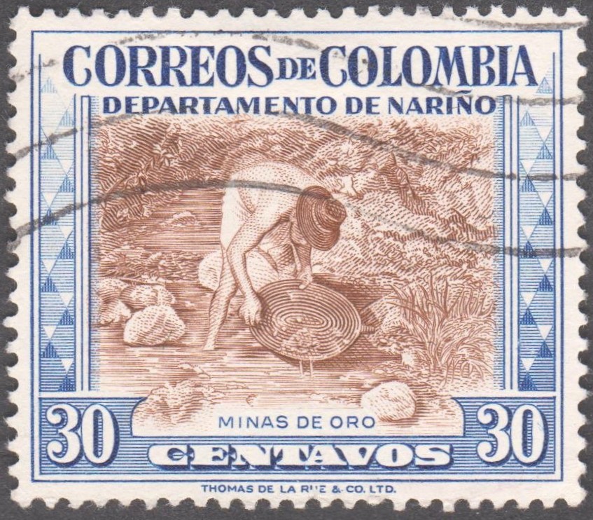 Zu diesem Thema paßt dieses Postwertzeihen aus Kolumbien, MiNr. 781, das einen Goldsucher = "Goldwäscher" zeigt, wie dieser gerade Gold findet: