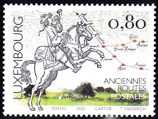 2020 sind in Luxemburg die Europamarken am 9. Juni 2020 zum Thema "Historische Postwege" erschienen. Hier zeige ich die Marke zu 0,80€ mit der Abbildung eines Postreiters nach einem Kupferstich und eine Landkarte mit der Wiener Linie durch Asselborn.