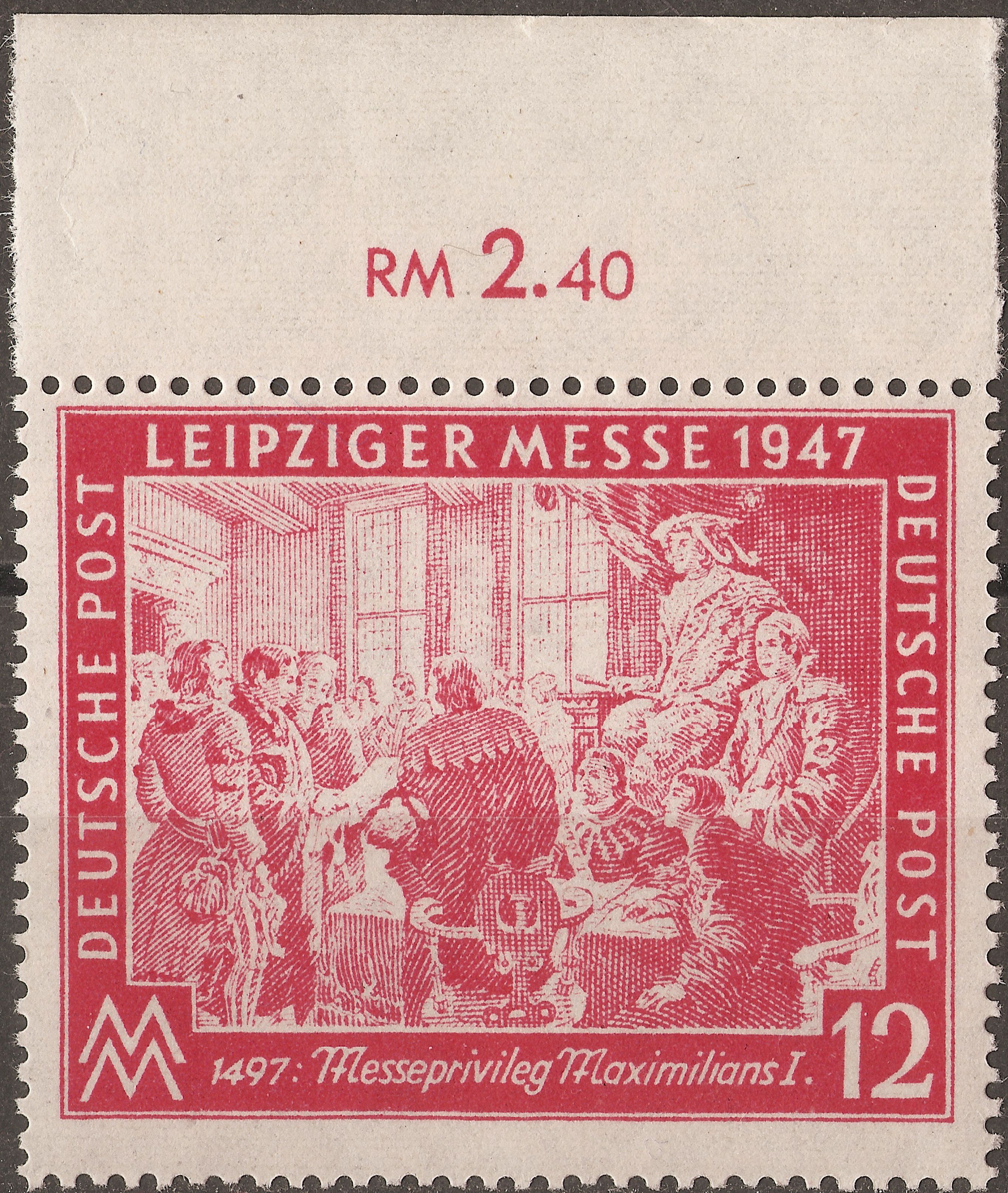 Postfrische Einzelmarke mit Michel-Plattenfehler IX: roter Punkt im ersten Abstrich des "M" von "Messeprivileg" (Feld 16).