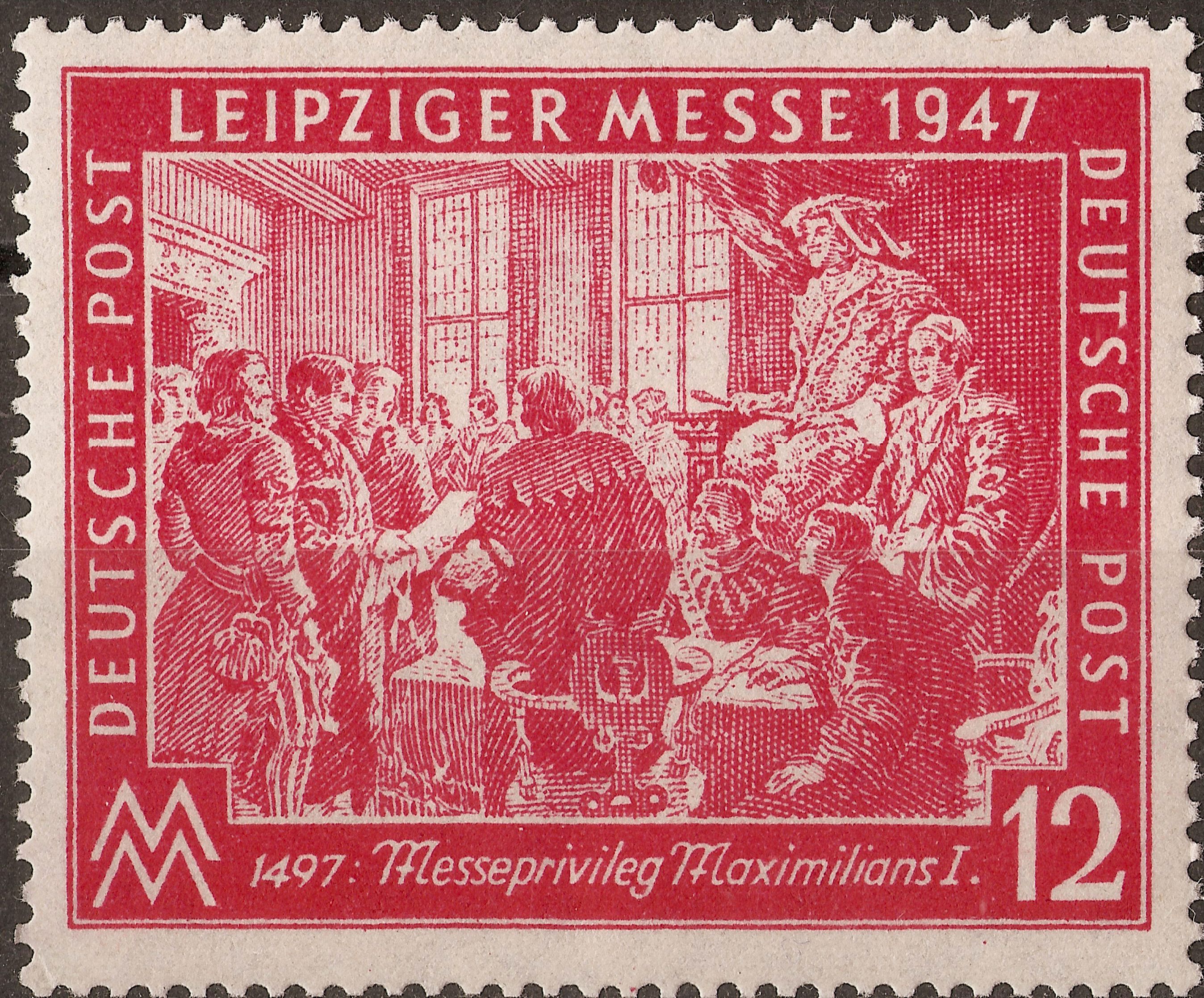 Postfrische Einzelmarke mit Michel-Plattenfehler X: Häkchen unter zweitem "e" in "Messeprivileg" (Feld 2, Teilaufl.).