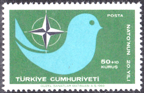 Diese Marke "20 Jahre NATO" mit einer Friedenstaube und dem NATO-Emblem ist in der Türkei (MiNr 2120) erschienen.