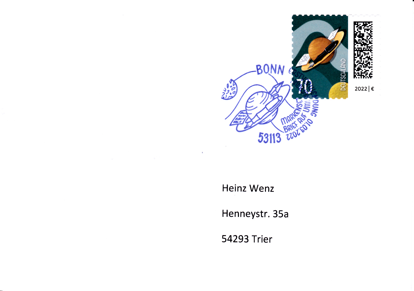 Am 1.3.2022 ist die nassklebende Marke zu 70 Cent (MiNr 3670) aus der Dauerserie "Welt der Briefe" erschienen. Sie zeigt die Abbildung "Briefe und Füller umkreisen Saturn".