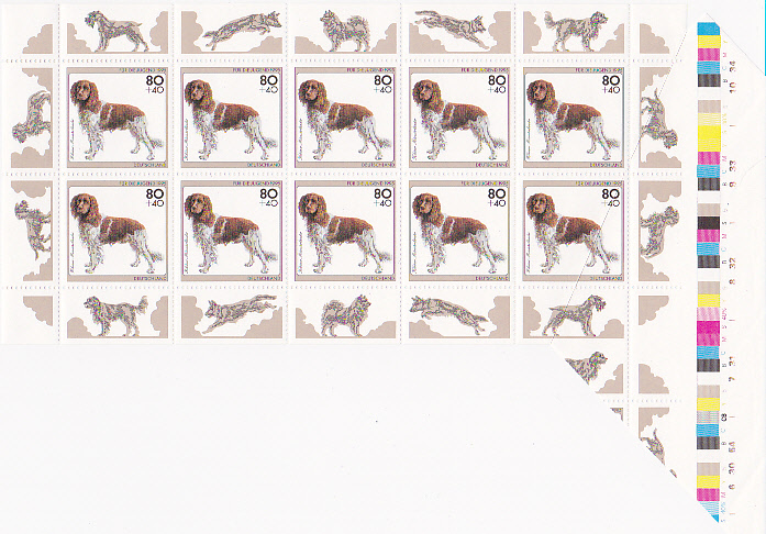Ein ungewöhnliches Bogenformat zeigt dieser Kleinbogen der 80+40 Pfennigmarke der Jugendmarkenausgabe von 1995. Vor dem Schneiden der Bogen war der Druckbogen geknickt (Knickfalte ist in der Abbildung zu sehen), so dass Teile des Papiers, die normalerweise abgeschnitten werden und Teile des nachfolgenden Bogen nicht abgetrennt wurden.