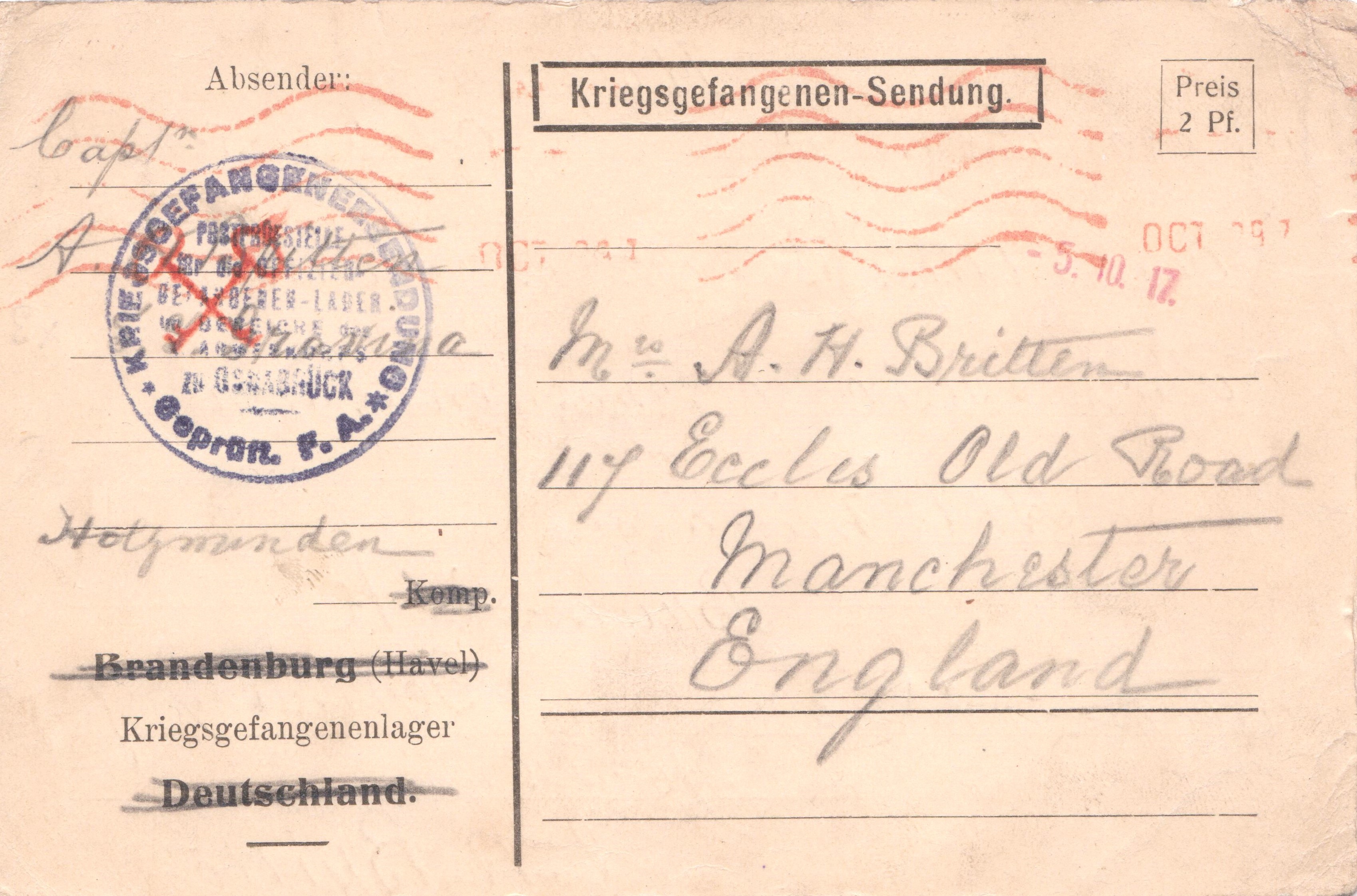 Verwendet wurde eine vorgedruckte Postkarte aus dem Kriegsgefangenenlager Brandenburg (Havel).