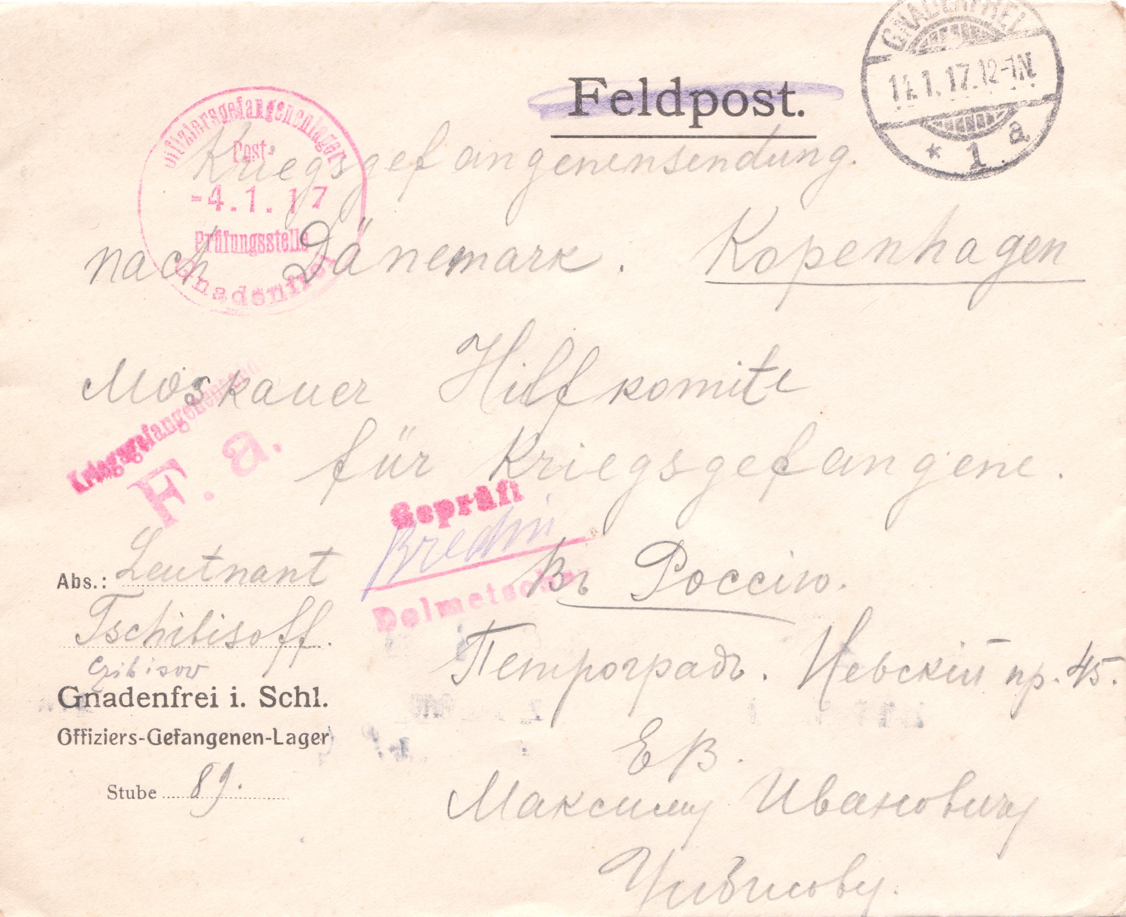 Kriegsgefangenensendung, aufgegeben im Offiziers-Gefangenen-Lager Gnadenfrei in Schlesien am 04.01.1917: