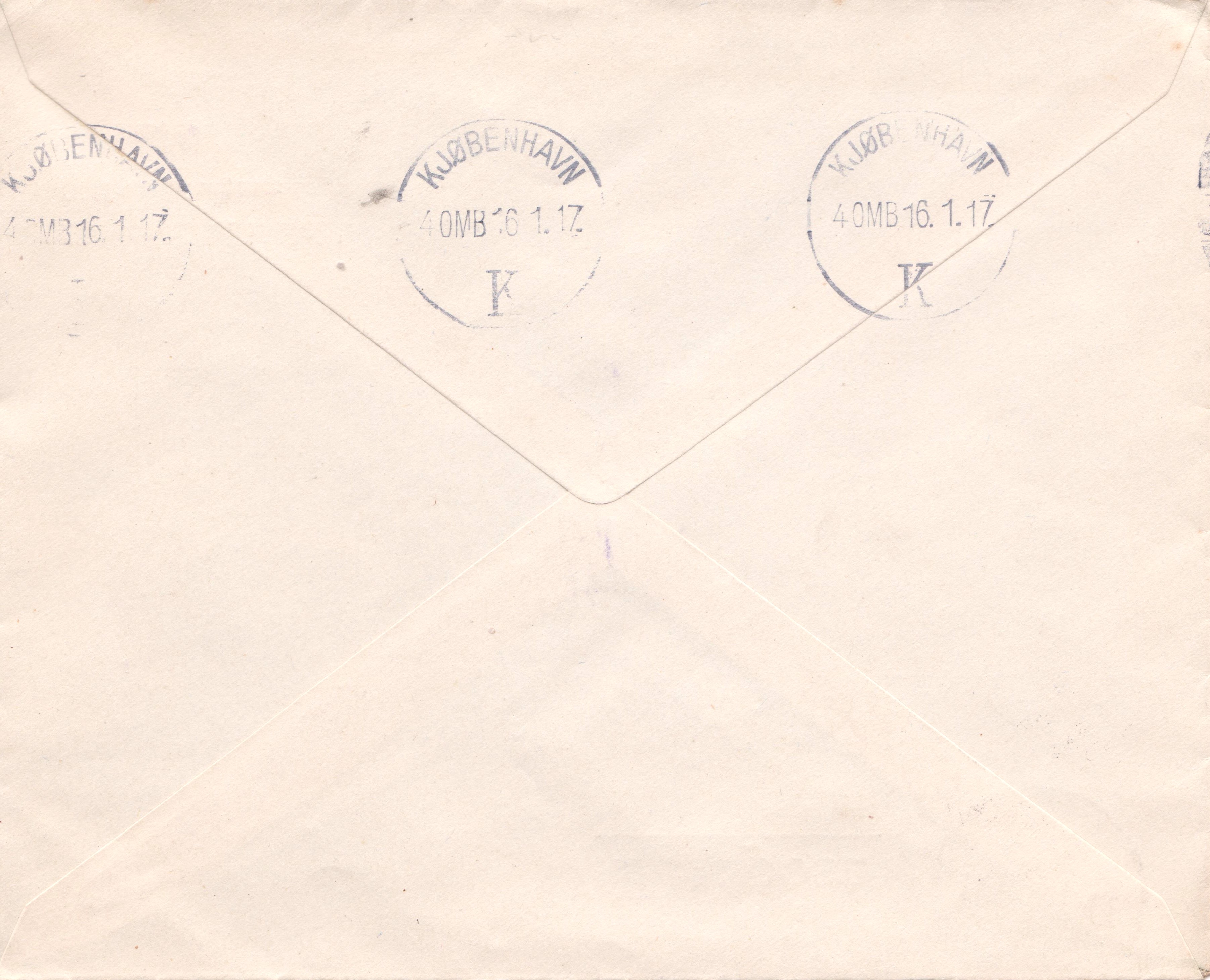 Laut rückseitig abgeschlagenem Maschinenstempel kam diese Sendung am 16.01.1917 in Kopenhagen an: