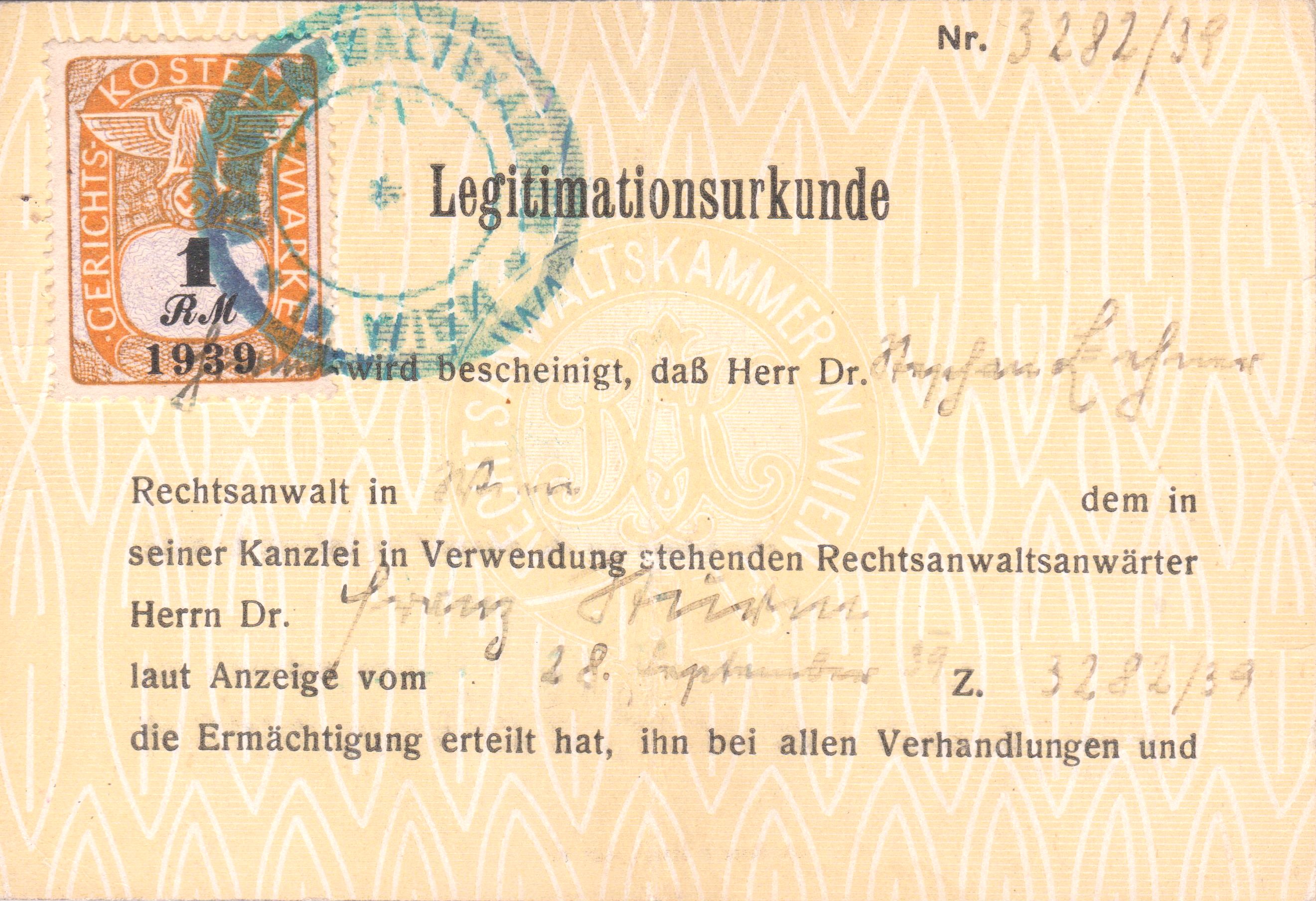 Legitimationsurkunde mit einer Gerichtskoatenmarke von 1939 zu 1 RM: