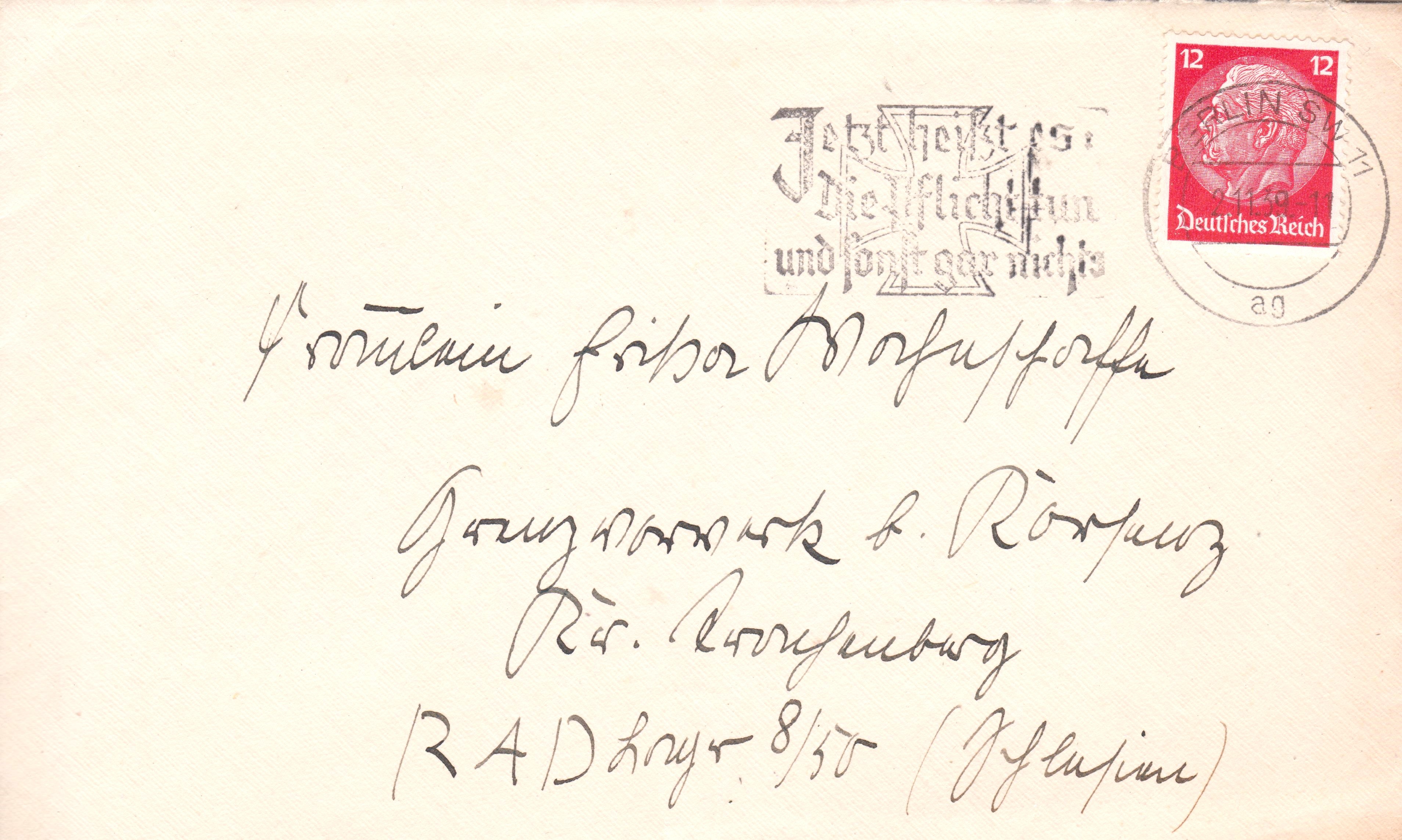 Brief im Fernverkehr, Portostufe 12 Pf, freigemacht per EF mit 12 Pf Dauerserie Hindenburg-Medaillon, entwertet mit Maschinenstempel BERLIN S.W. 11 mit Propaganda-Werbeeinsatz "Jetzt heißt es: Die Pflicht tun uns sonst gar nichts":
