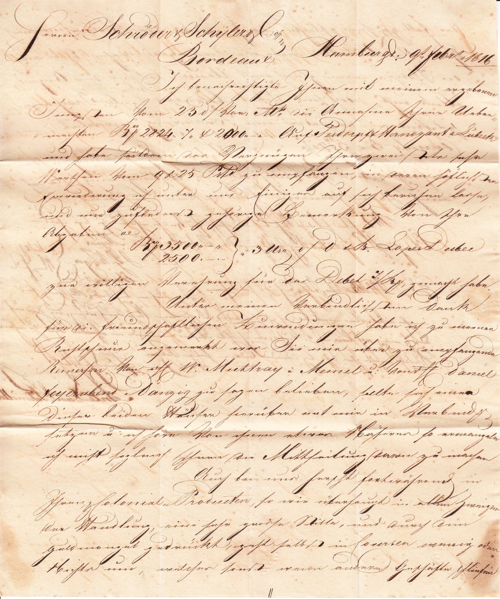 Dieser nach Bordeaux adressierte Brief wurde am 09.02.1816 geschrieben und in Hamburg aufgegeben, was ein Langstempel "R.4.HAMBURG", Feuser 1349-8, dokumentiert: